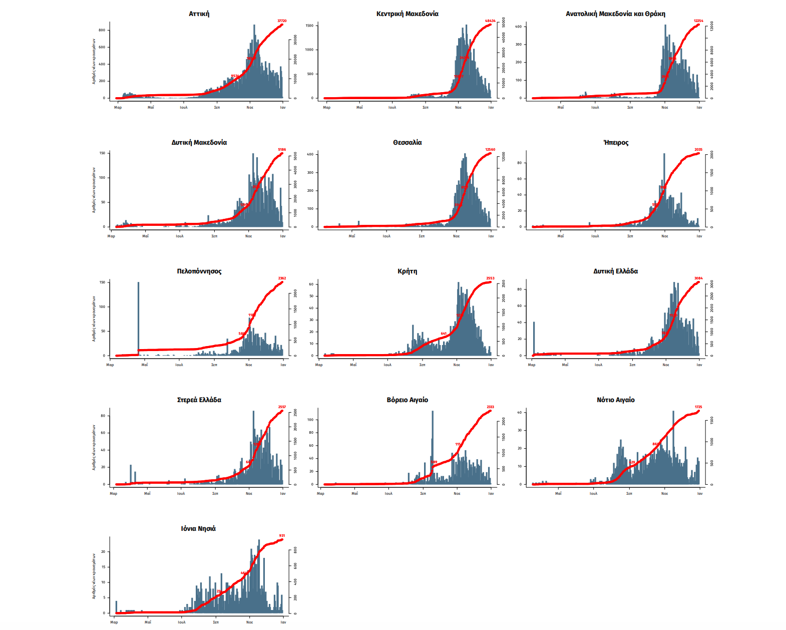 Παράρτημα 1: Επιδημικές καμπύλες κρουσμάτων COVID-19 με βάση την δηλωθείσα διεύθυνση μόνιμης κατοικίας του κρούσματος ή τη διεύθυνση προσωρινής διαμονής για τους τουρίστες και άλλους προσωρινά διαμένοντες στην Ελλάδα. Συμπεριλαμβάνονται τόσο κρούσματα με ιστορικό ταξιδίου όσο και κρούσματα με πιθανή εγχώρια μετάδοση.