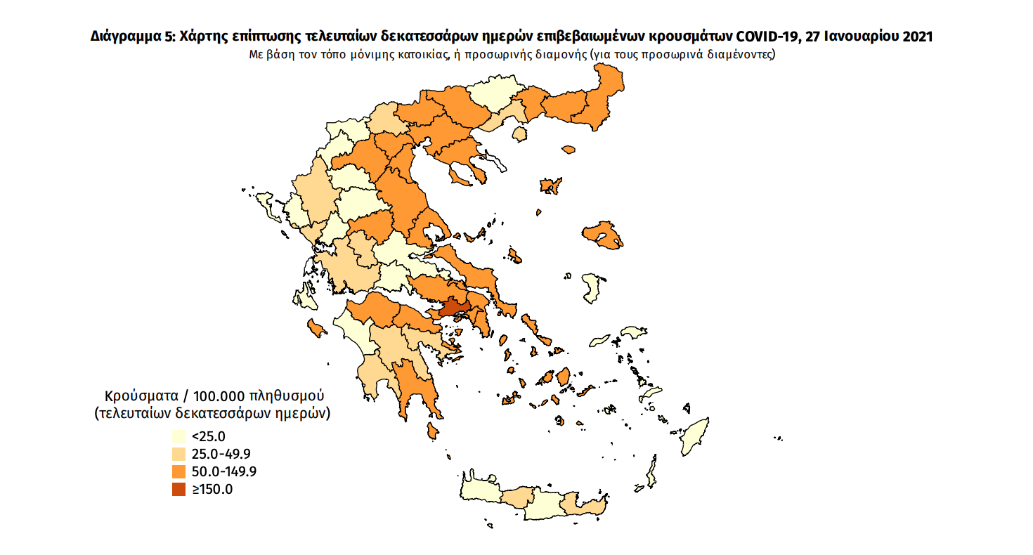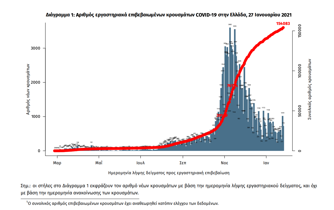 Τα στοιχεία που παρουσιάζονται αφορούν περιστατικά από την επιδημιολογική επιτήρηση της νόσου από το νέο κορωνοϊό (COVID19), με βάση τα δεδομένα που έχουν δηλωθεί στον ΕΟΔΥ και καταγραφεί μέχρι τις 27 Ιανουαρίου 2021 (ώρα 15:00). Τα νέα εργαστηριακά επιβεβαιωμένα κρούσματα της νόσου είναι 858, εκ των οποίων 11 εντοπίστηκαν κατόπιν ελέγχων στις πύλες εισόδου της χώρας.
