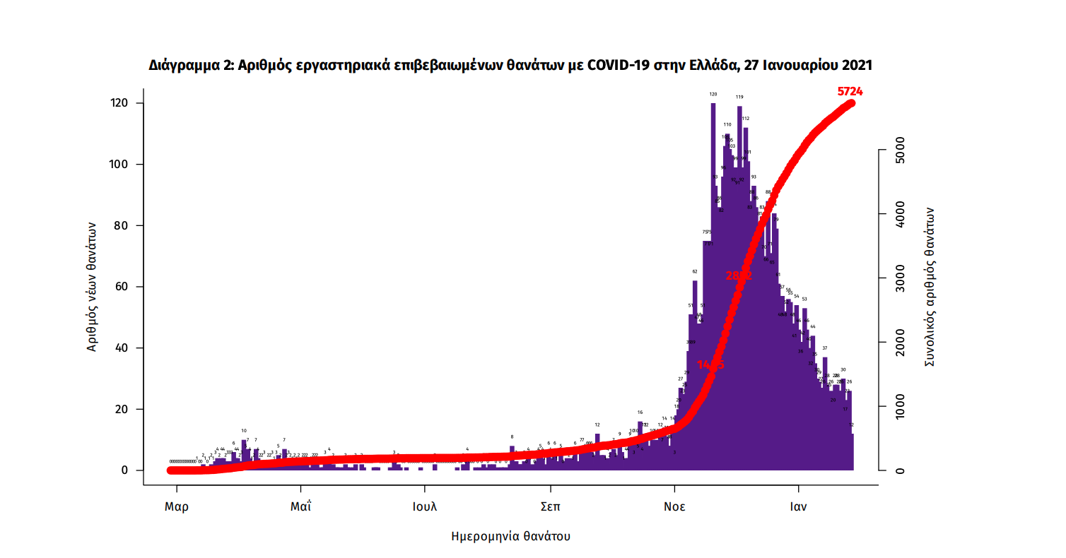 Τέλος, έχουμε 32 νέους θανάτους από τη νόσο COVID-19, φθάνοντας τους 5724 θανάτους συνολικά στη χώρα, εκ των οποίων 3367 (58.8%) άνδρες. Η διάμεση ηλικία των θανόντων συμπολιτών μας ήταν τα 79 έτη και το 95.4% είχε κάποιο υποκείμενο νόσημα ή/και ηλικία 70 ετών και άνω.