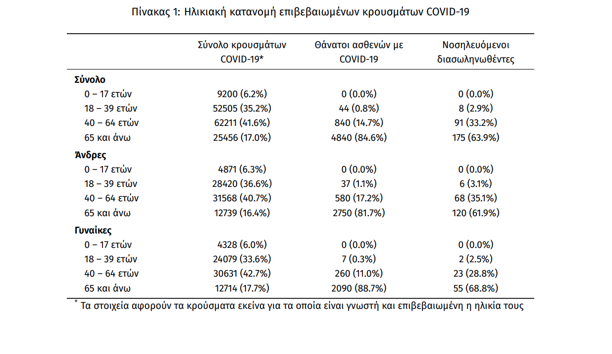 Η διάμεση ηλικία των κρουσμάτων είναι 44 έτη (εύρος 0.2 έως 105 ετών), ενώ η διάμεση ηλικία των θανάτων είναι 79 έτη (εύρος 24 έως 103 ετών). Η ηλικιακή κατανομή των (α) συνολικών κρουσμάτων, (β) των περιστατικών που κατέληξαν σε θάνατο και (γ) των ασθενών που νοσηλεύονται διασωληνωμένοι, είναι η ακόλουθη: