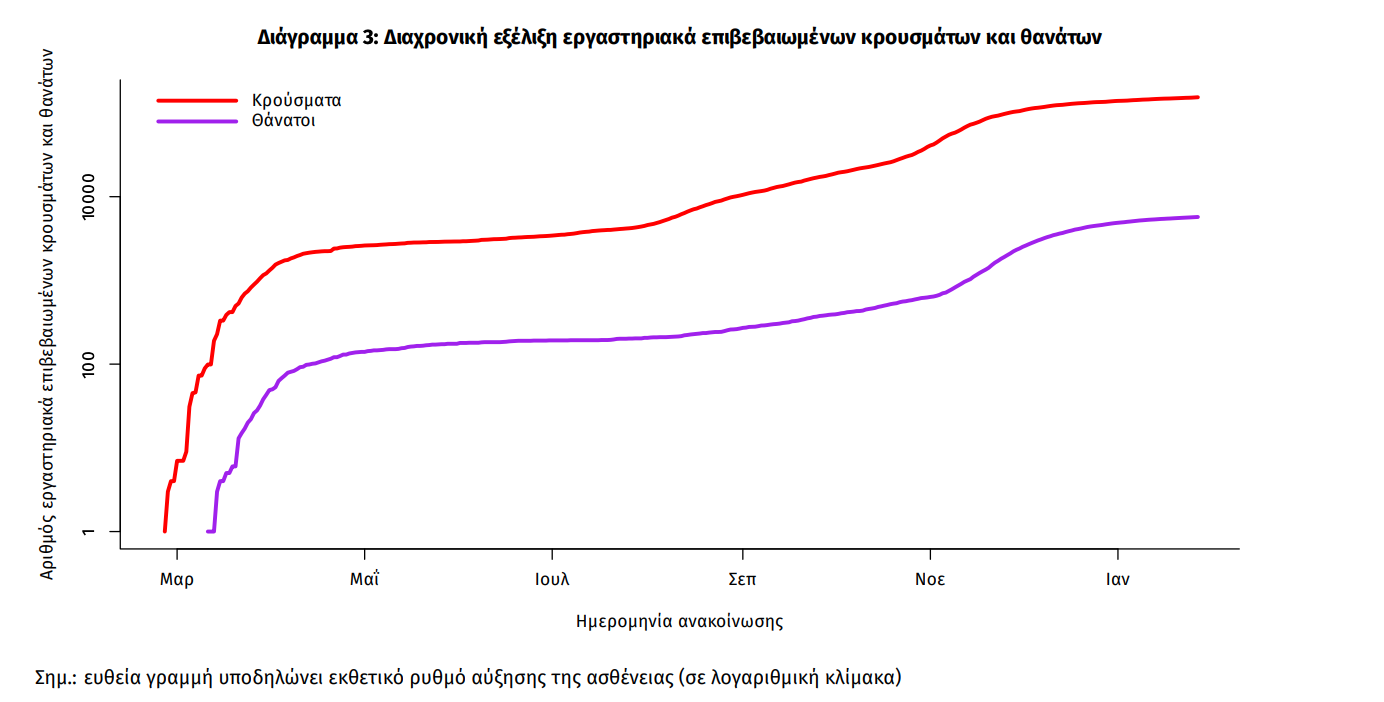 Η διαχρονική εξέλιξη των συνολικών κρουσμάτων και συνολικού αριθμού των θανάτων ασθενών COVID-19 παρουσιάζεται στο ακόλουθο διάγραμμα.