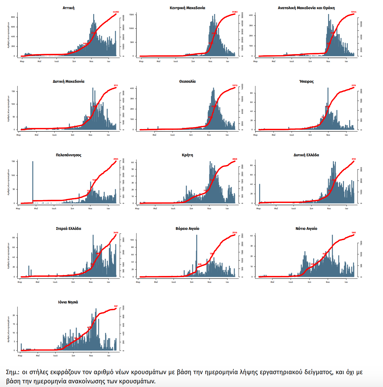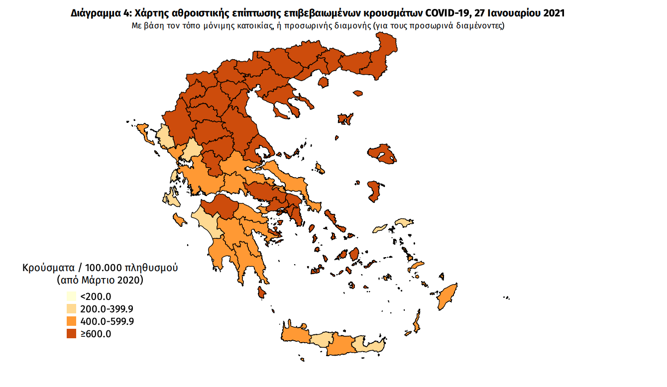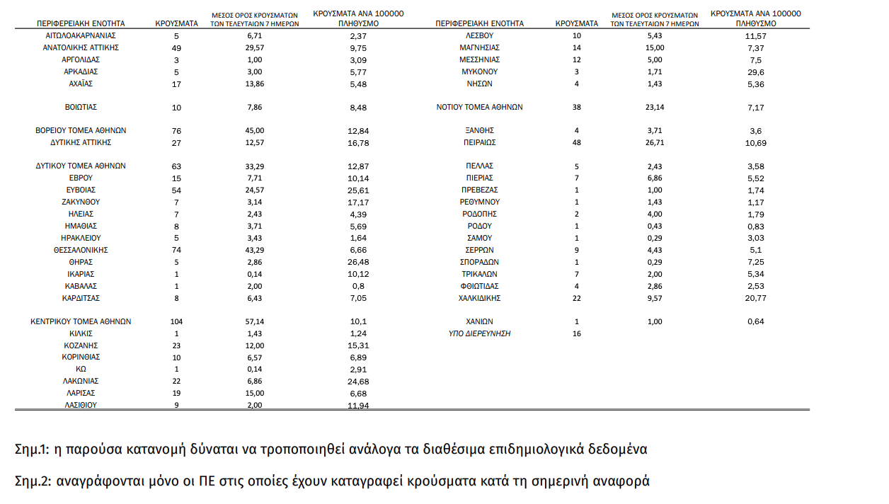 Γεωγραφική διασπορά Ο χάρτης αποτυπώνει τη γεωγραφική κατανομή των συνολικών κρουσμάτων COVID-19 (από την αρχή της επιδημίας) ανά Περιφερειακή Ενότητα της χώρας, με βάση την δηλωθείσα διεύθυνση μόνιμης κατοικίας του ασθενούς, ή τη διεύθυνση προσωρινής διαμονής για τους τουρίστες και άλλους προσωρινά διαμένοντες στην Ελλάδα. Συμπεριλαμβάνονται τόσο κρούσματα με ιστορικό ταξιδίου (“εισαγόμενα”) όσο και κρούσματα με πιθανή εγχώρια μετάδοση
