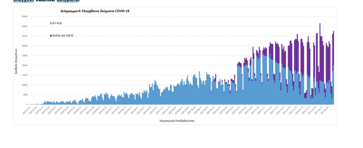 Δείγματα που έχουν ελεγχθεί: Από την 1η Ιανουαρίου 2020 μέχρι σήμερα, στα εργαστήρια που διενεργούν ελέγχους για τον νέο κορωνοϊό (SARS-CoV-2) και που δηλώνουν συστηματικά στον ΕΟΔΥ το σύνολο των δειγμάτων που ελέγχουν, έχουν συνολικά ελεγχθεί 3.071.337 κλινικά δείγματα ενώ από Μονάδες Υγείας και Κλιμάκια του ΕΟΔΥ που διενεργούν ελέγχους Rapid Ag έχουν ελεγχθεί 985.492 δείγματα