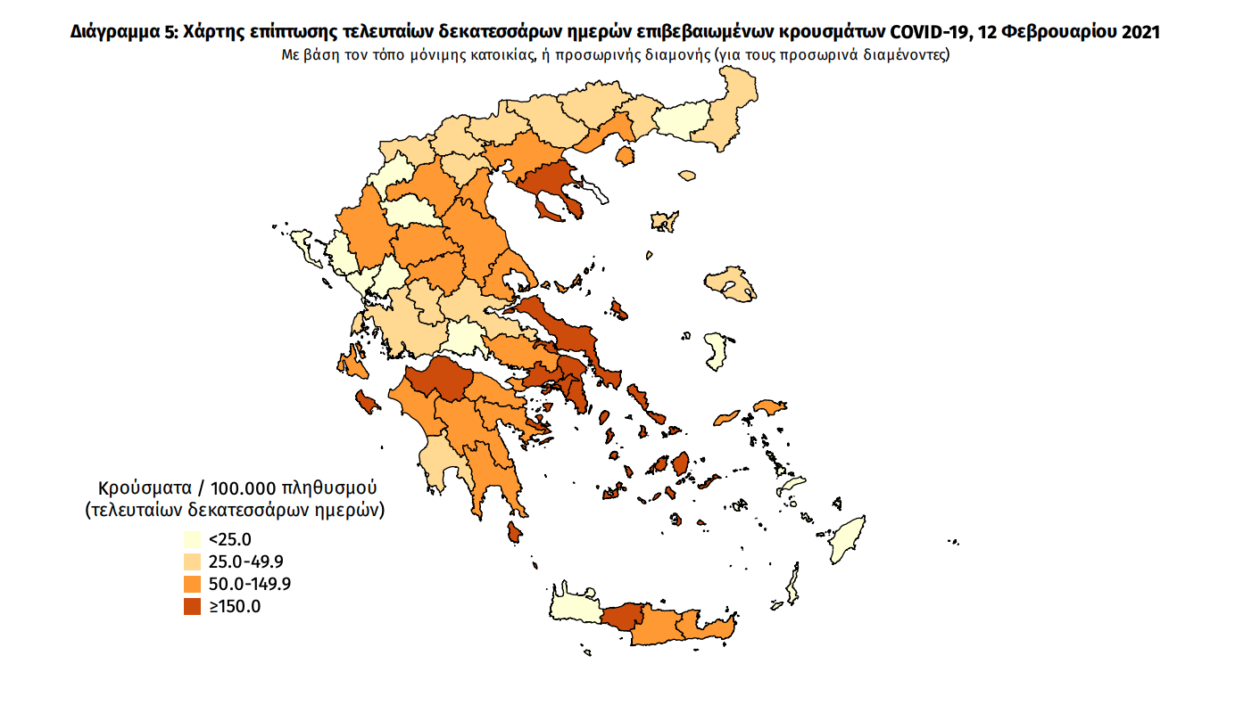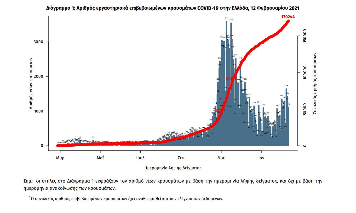 Τα στοιχεία που παρουσιάζονται αφορούν περιστατικά από την επιδημιολογική επιτήρηση της νόσου από το νέο κορωνοϊό (COVID19), με βάση τα δεδομένα που έχουν δηλωθεί στον ΕΟΔΥ και καταγραφεί μέχρι τις 12 Φεβρουαρίου 2021 (ώρα 15:00). Τα νέα εργαστηριακά επιβεβαιωμένα κρούσματα της νόσου είναι 1410, εκ των οποίων κανένα δεν εντοπίστηκε σε ελέγχους στις πύλες εισόδου της χώρας. Ο συνολικός αριθμός των κρουσμάτων ανέρχεται σε 170244 (ημερήσια μεταβολή +0.8%), εκ των οποίων 51.9% άνδρες. 1