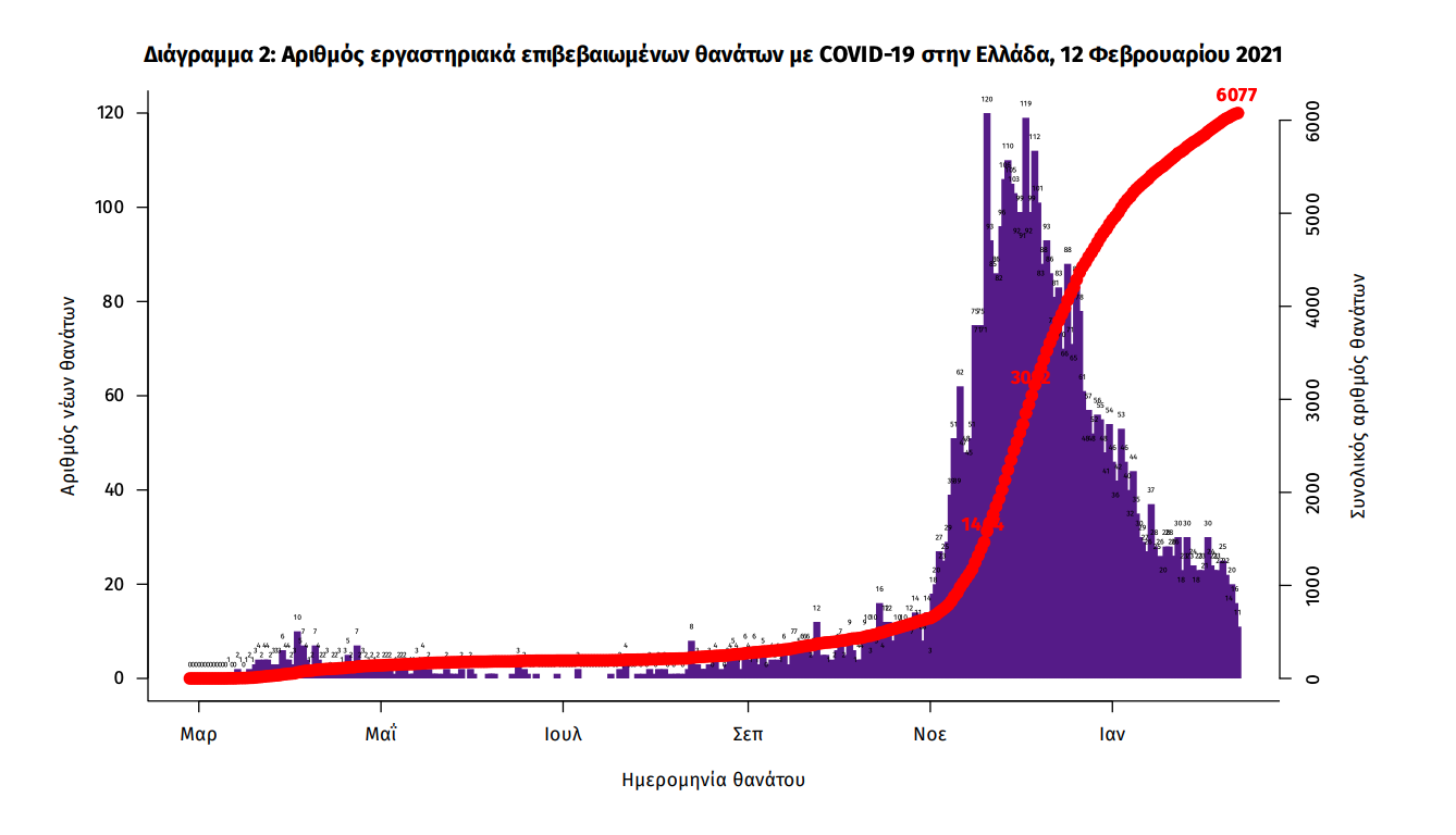 Οι νέοι θάνατοι ασθενών με COVID-19 είναι 21, ενώ από την έναρξη της επιδημίας έχουν καταγραφεί συνολικά 6077 θάνατοι. Η διάμεση ηλικία των ασθενών που απεβίωσαν είναι 79 έτη. Ο αριθμός των ασθενών που νοσηλεύονται διασωληνωμένοι είναι 293 (72.7% άνδρες). Η ημερήσια κατανομή των εργαστηριακά επιβεβαιωμένων κρουσμάτων είναι η ακόλουθη (η γραμμή παριστάνει την συνολική, αθροιστική κατανομή των κρουσμάτων).