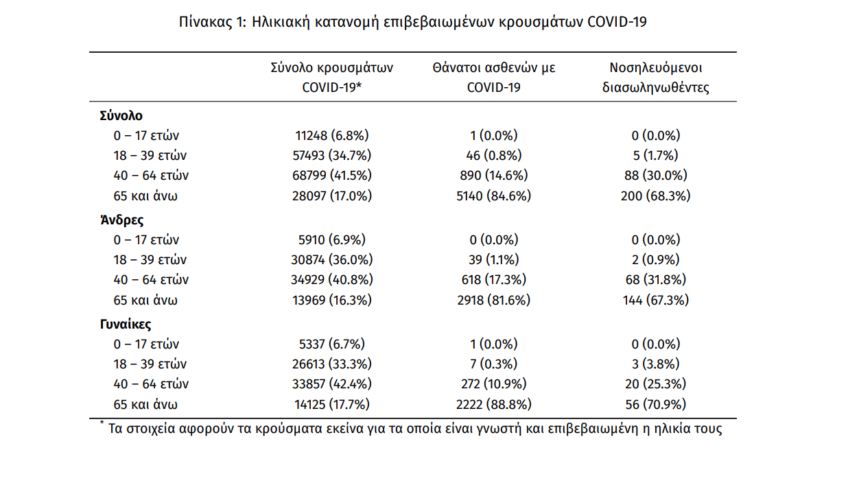 Η διάμεση ηλικία των κρουσμάτων είναι 44 έτη (εύρος 0.2 έως 105 έτη), ενώ η διάμεση ηλικία των θανάτων είναι 79 έτη (εύρος 15 έως 103 έτη). Η ηλικιακή κατανομή των (α) συνολικών κρουσμάτων, (β) των περιστατικών που κατέληξαν σε θάνατο και (γ) των ασθενών που νοσηλεύονται διασωληνωμένοι, είναι η ακόλουθη: