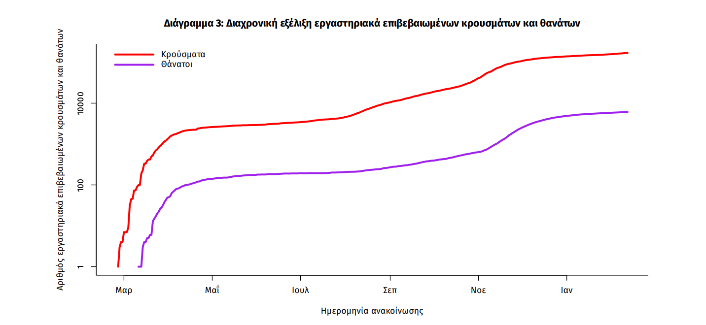 Η διαχρονική εξέλιξη των συνολικών κρουσμάτων και συνολικού αριθμού των θανάτων ασθενών COVID-19 παρουσιάζεται στο ακόλουθο διάγραμμα.