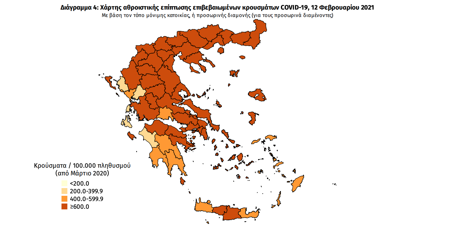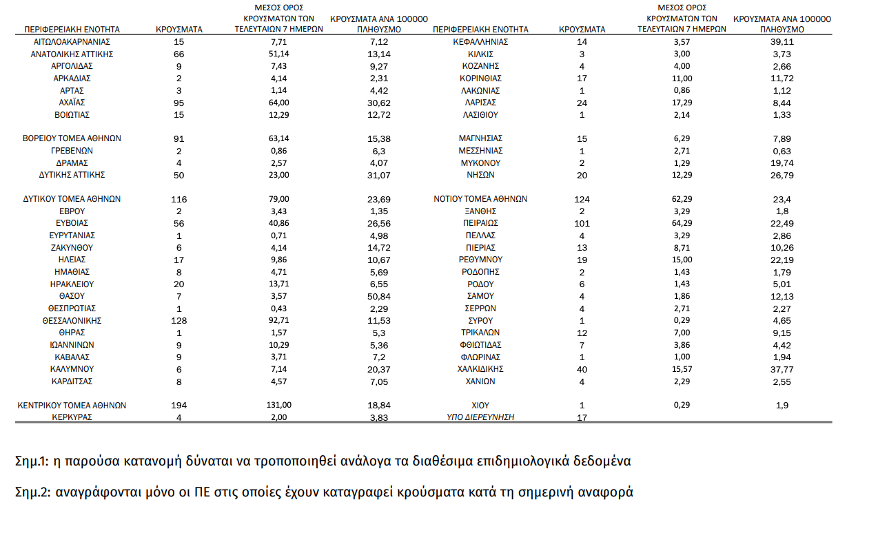 Γεωγραφική διασπορά Ο χάρτης αποτυπώνει τη γεωγραφική κατανομή των συνολικών κρουσμάτων COVID-19 (από την αρχή της επιδημίας) ανά Περιφερειακή Ενότητα της χώρας, με βάση την δηλωθείσα διεύθυνση μόνιμης κατοικίας του ασθενούς, ή τη διεύθυνση προσωρινής διαμονής για τους τουρίστες και άλλους προσωρινά διαμένοντες στην Ελλάδα. Συμπεριλαμβάνονται τόσο κρούσματα με ιστορικό ταξιδίου (“εισαγόμενα”) όσο και κρούσματα με πιθανή εγχώρια μετάδοση.