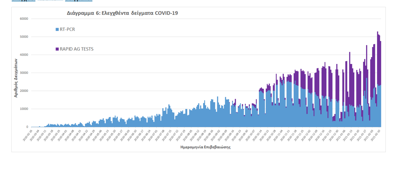 Δείγματα που έχουν ελεγχθεί: Από την 1η Ιανουαρίου 2020 μέχρι σήμερα, στα εργαστήρια που διενεργούν ελέγχους για τον νέο κορωνοϊό (SARS-CoV-2) και που δηλώνουν συστηματικά στον ΕΟΔΥ το σύνολο των δειγμάτων που ελέγχουν, έχουν συνολικά ελεγχθεί 3.346.594 κλινικά δείγματα ενώ από Μονάδες Υγείας και Κλιμάκια του ΕΟΔΥ που διενεργούν ελέγχους Rapid Ag έχουν ελεγχθεί 1.301.812 δείγματα.