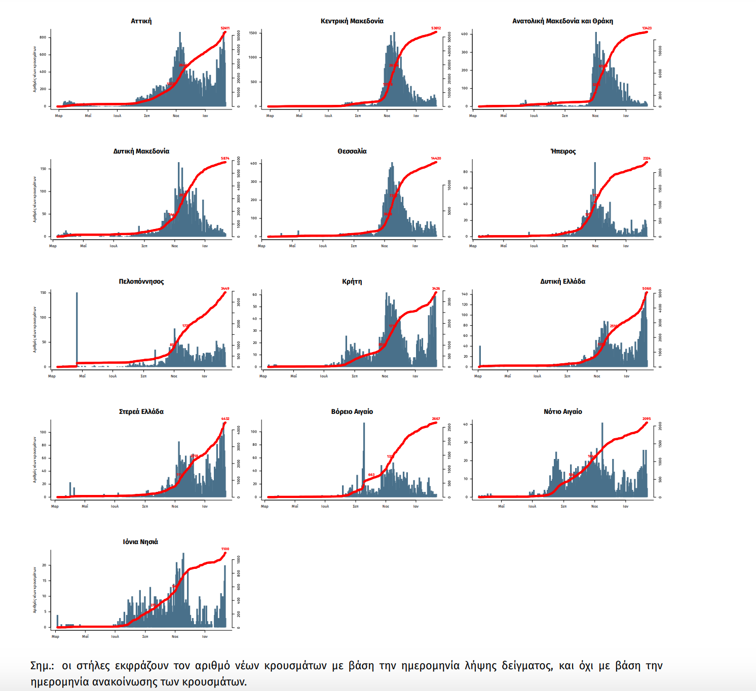 Παράρτημα 1: Επιδημικές καμπύλες κρουσμάτων COVID-19 με βάση την δηλωθείσα διεύθυνση μόνιμης κατοικίας του κρούσματος ή τη διεύθυνση προσωρινής διαμονής για τους τουρίστες και άλλους προσωρινά διαμένοντες στην Ελλάδα. Συμπεριλαμβάνονται τόσο κρούσματα με ιστορικό ταξιδίου όσο και κρούσματα με πιθανή εγχώρια μετάδοση.