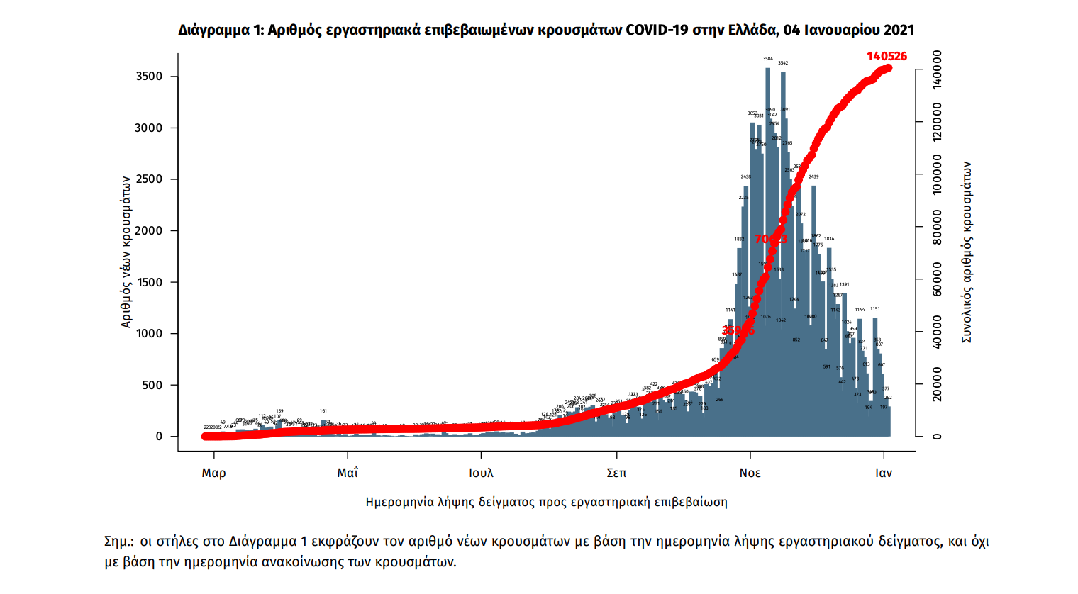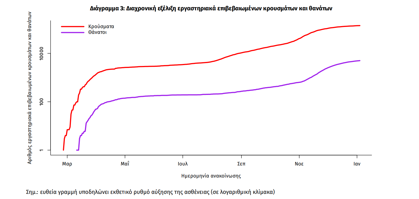 Η διαχρονική εξέλιξη των συνολικών κρουσμάτων και συνολικού αριθμού των θανάτων ασθενών COVID-19 παρουσιάζεται στο ακόλουθο διάγραμμα.