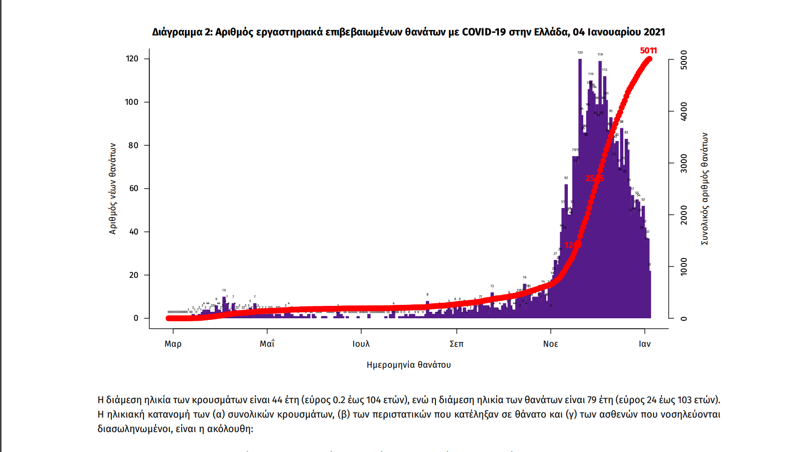 Οι νέοι θάνατοι ασθενών με COVID-19 είναι 54, ενώ από την έναρξη της επιδημίας έχουν καταγραφεί συνολικά 5011 θάνατοι.Η διάμεση ηλικία των ασθενών που απεβίωσαν είναι 79 έτη. Ο αριθμός των ασθενών που νοσηλεύονται διασωληνωμένοι είναι 407 (65.8% άνδρες). Η ημερήσια κατανομή των επιβεβαιωμένων κρουσμάτων είναι η ακόλουθη (η γραμμή παριστάνει την συνολική, αθροιστική κατανομή των κρουσμάτων).