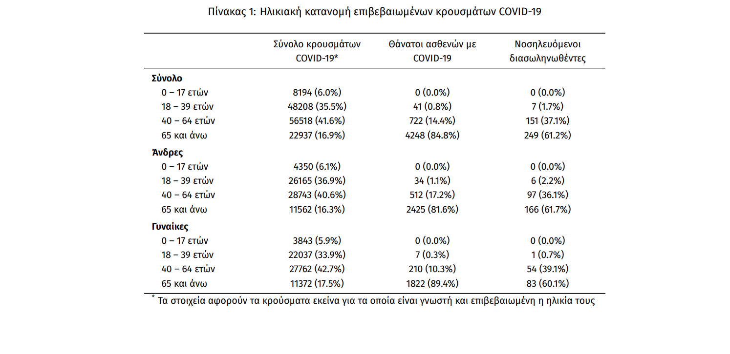 Τέλος, έχουμε 54 νέους θανάτους από τη νόσο COVID-19, φθάνοντας τους 5011 θανάτους συνολικά στη χώρα, εκ των οποίων 2976 (59.4%) άνδρες. Η διάμεση ηλικία των θανόντων συμπολιτών μας ήταν τα 79 έτη και το 95.5% είχε κάποιο υποκείμενο νόσημα ή/και ηλικία 70 ετών και άνω.