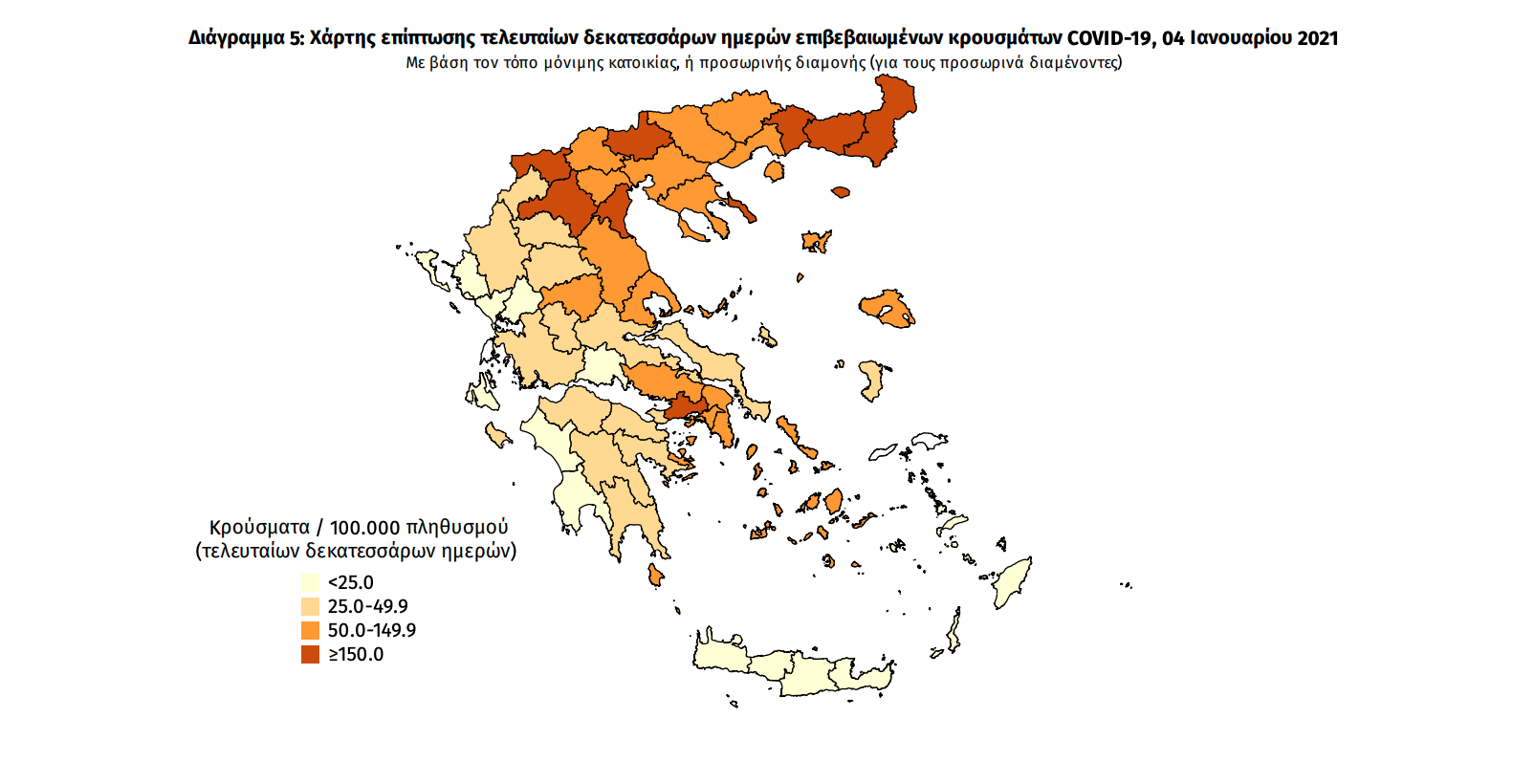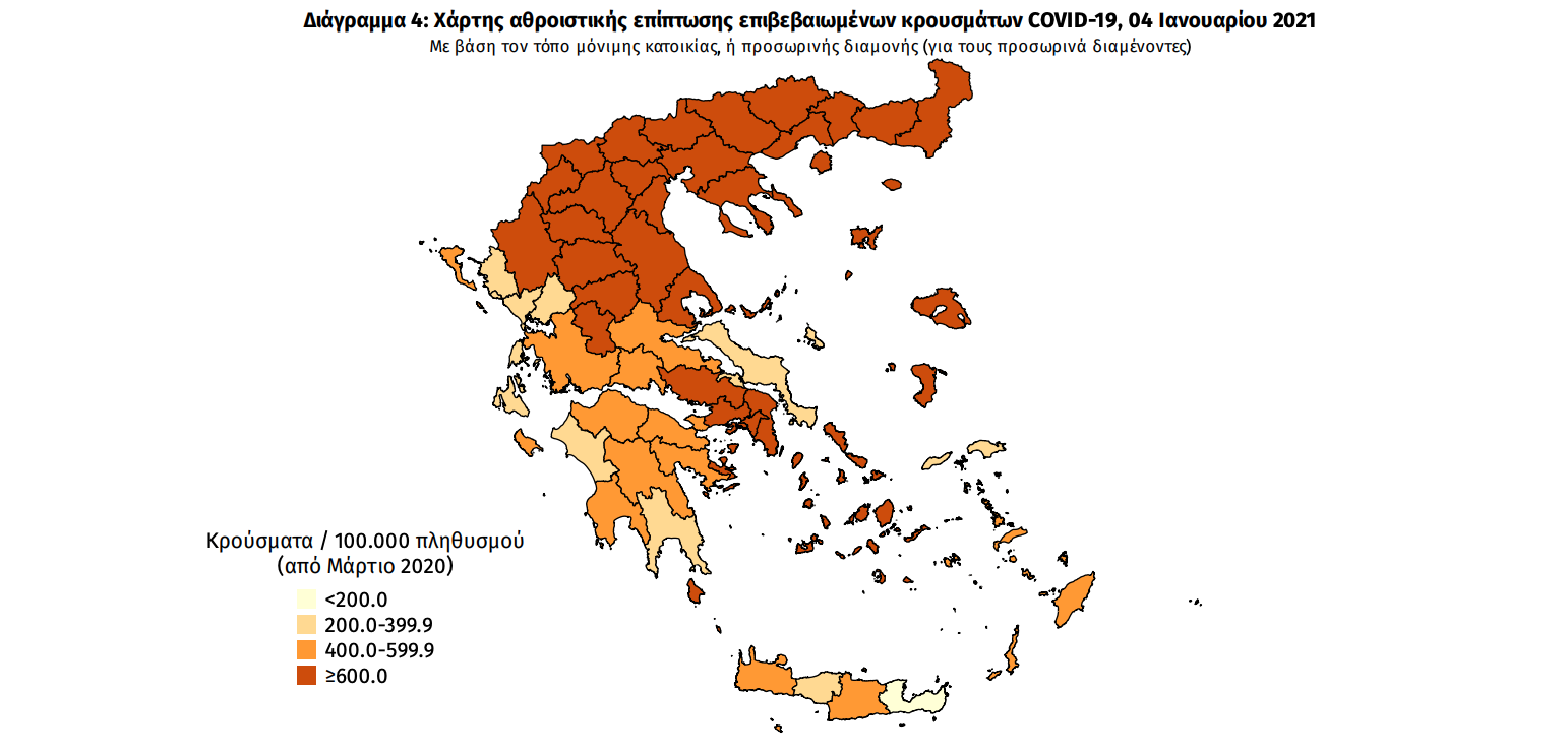Γεωγραφική διασπορά Ο χάρτης αποτυπώνει τη γεωγραφική κατανομή των συνολικών κρουσμάτων COVID-19 (από την αρχή της επιδημίας) ανά Περιφερειακή Ενότητα της χώρας, με βάση την δηλωθείσα διεύθυνση μόνιμης κατοικίας του ασθενούς, ή τη διεύθυνση προσωρινής διαμονής για τους τουρίστες και άλλους προσωρινά διαμένοντες στην Ελλάδα. Συμπεριλαμβάνονται τόσο κρούσματα με ιστορικό ταξιδίου (“εισαγόμενα”) όσο και κρούσματα με πιθανή εγχώρια μετάδοση.