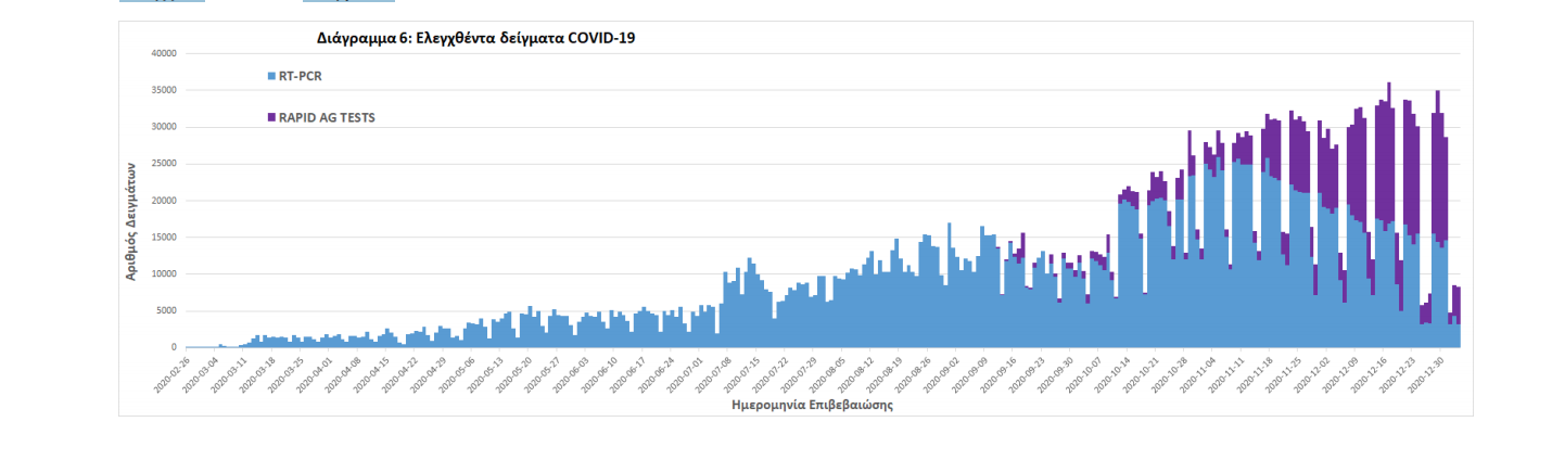 Δείγματα που έχουν ελεγχθεί: Από την 1η Ιανουαρίου 2020 μέχρι σήμερα, στα εργαστήρια που διενεργούν ελέγχους για τον νέο κορωνοϊό (SARS-CoV-2) και που δηλώνουν συστηματικά στον ΕΟΔΥ το σύνολο των δειγμάτων που ελέγχουν, έχουν συνολικά ελεγχθεί 2.828.461 κλινικά δείγματα ενώ από Μονάδες Υγείας και Κλιμάκια του ΕΟΔΥ που διενεργούν ελέγχους Rapid Ag έχουν ελεγχθεί 604.250 δείγματα