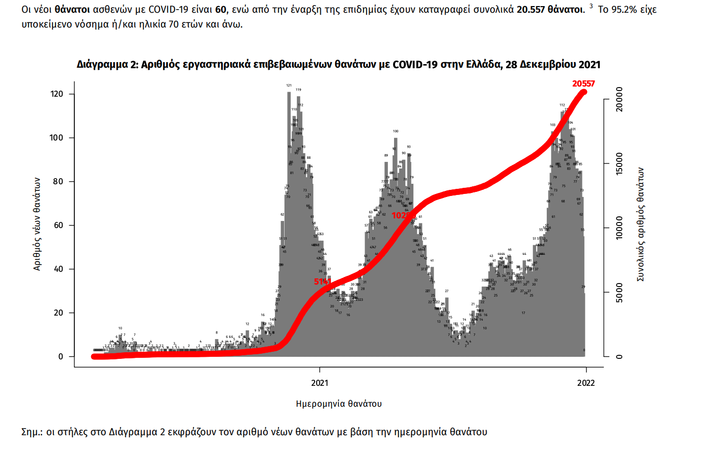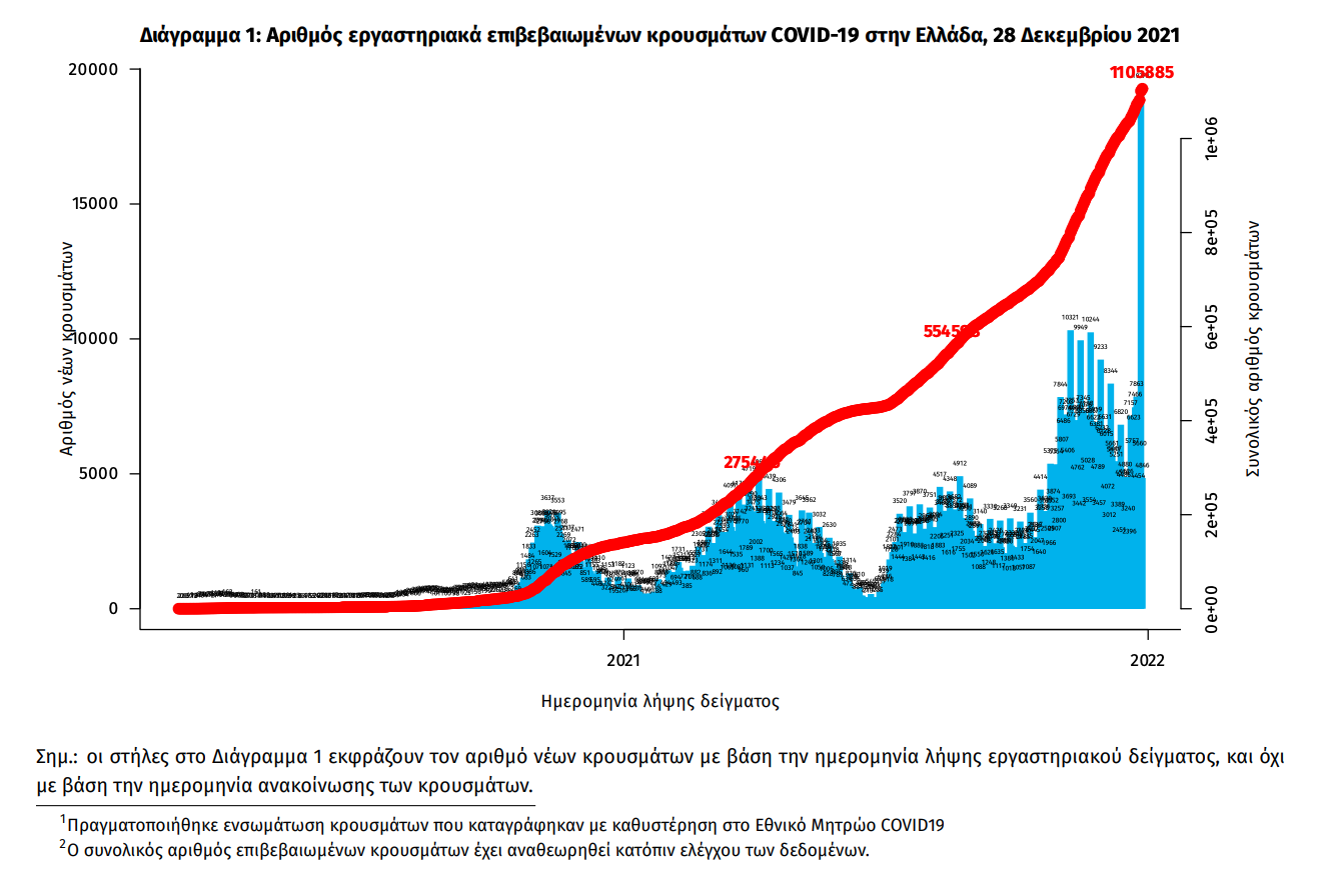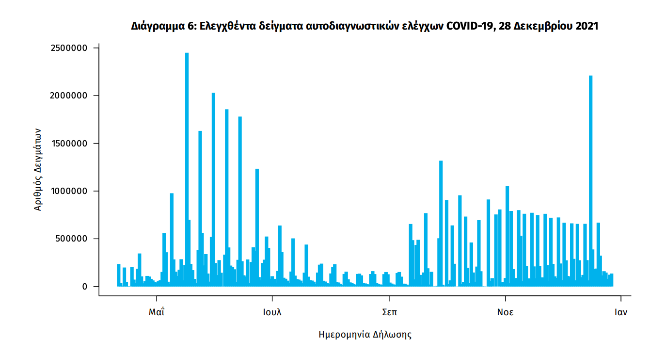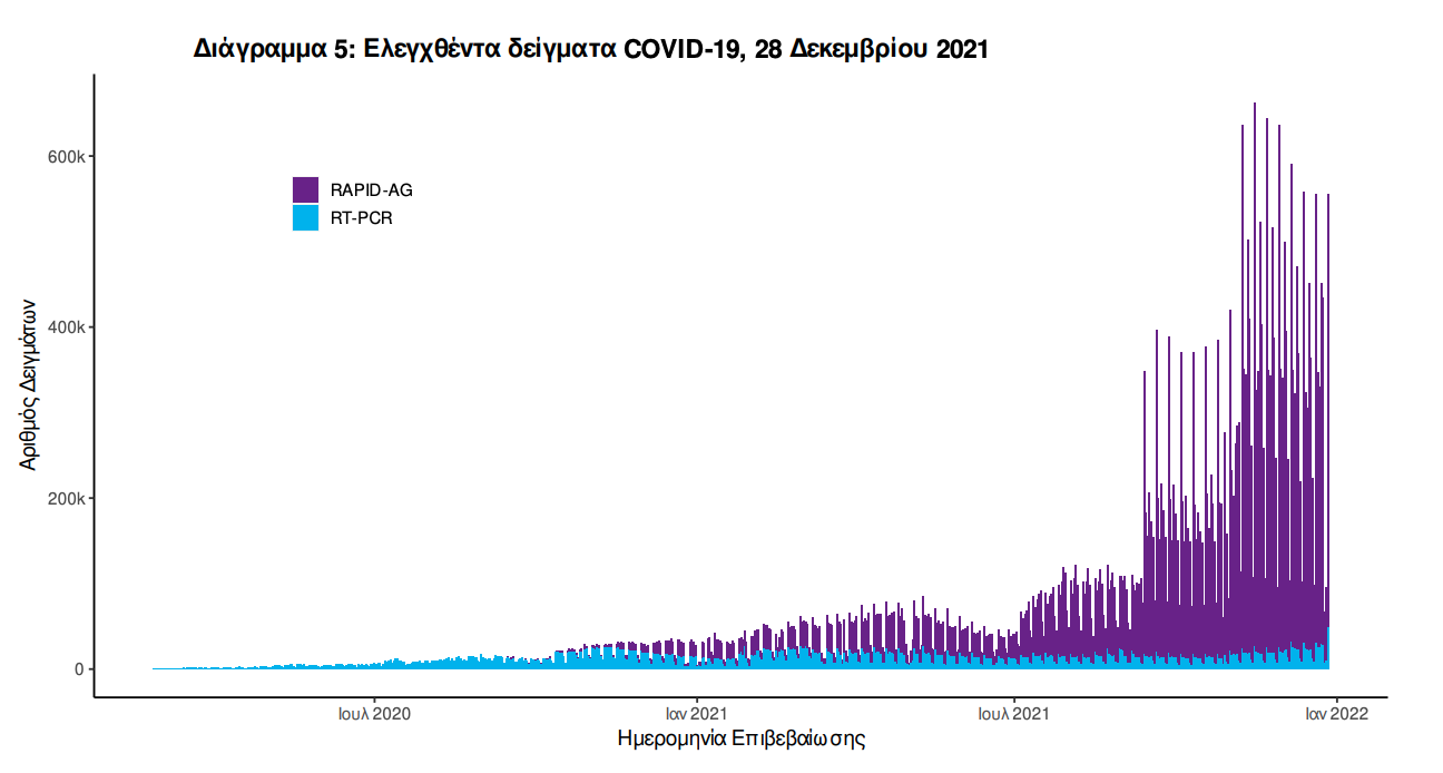 Δείγματα που έχουν ελεγχθεί: Από την 1η Ιανουαρίου 2020 μέχρι σήμερα, στα εργαστήρια που διενεργούν ελέγχους για τον νέο κορωνοϊό (SARS-CoV-2) και που δηλώνουν συστηματικά το σύνολο των δειγμάτων που ελέγχουν, έχουν συνολικά ελεγχθεί 8.091.939 κλινικά δείγματα ενώ από Μονάδες Υγείας και Κλιμάκια του ΕΟΔΥ που διενεργούν ελέγχους Rapid Ag έχουν ελεγχθεί 37.789.226 δείγματα. O μέσος όρος του επταημέρου είναι 325.997 δειγματοληπτικοί έλεγχοι. Αυτοδιαγνωστικοί έλεγχοι (Self-tests): Έως 27 Δεκεμβρίου 2021, έχουν καταγραφεί ηλεκτρονικά 66.606.273 δηλώσεις αποτελέσματος αυτοδιαγνωστικού ελέγχου, ενώ 3.811.192 άτομα προσήλθαν για επανέλεγχο. Mαζικές Δειγματοληψίες ΕΟΔΥ: Στις 27 Δεκεμβρίου 2021, πραγματοποιήθηκαν 132 δράσεις δειγματοληπτικών ελέγχων από τις Κινητές Ομάδες Υγείας (ΚΟΜΥ) του ΕΟΔΥ, στις οποίες διενεργήθηκαν 32.743 έλεγχοι Rapid Ag και ανευρέθηκαν 2.008 θετικά (6,13%).