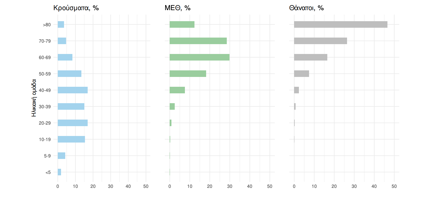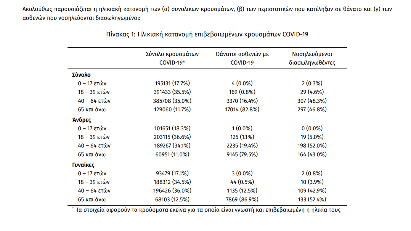 Ο αριθμός των ασθενών που νοσηλεύονται διασωληνωμένοι είναι 635 (60.3% άνδρες). Η διάμεση ηλικία τους είναι 63 έτη. To 79.8% έχει υποκείμενο νόσημα ή/και ηλικία 70 ετών και άνω. Μεταξύ των ασθενών που νοσηλεύονται διασωληνωμένοι, 540 (85.04%) είναι ανεμβολίαστοι ή μερικώς εμβολιασμένοι και 95 (14.96%) είναι πλήρως εμβολιασμένοι. Από την αρχή της πανδημίας έχουν εξέλθει από τις ΜΕΘ 3.734 ασθενείς. Οι εισαγωγές4 νέων ασθενών Covid-19 στα νοσοκομεία της επικράτειας είναι 340 (ημερήσια μεταβολή +17.65%). Ο μέσος όρος εισαγωγών του επταημέρου είναι 324 ασθενείς.Η διάμεση ηλικία των κρουσμάτων είναι 38 έτη (εύρος 0.2 έως 106 έτη), ενώ η διάμεση ηλικία των θανόντων είναι 78 έτη (εύρος 0.2 έως 106 έτη). Διάγραμμα 4: Ηλικιακή Κατανομή κρουσμάτων, νοσηλευόμενων στις MEΘ και ασθενών που απεβίωσαν από την αρχή της πανδημίας
