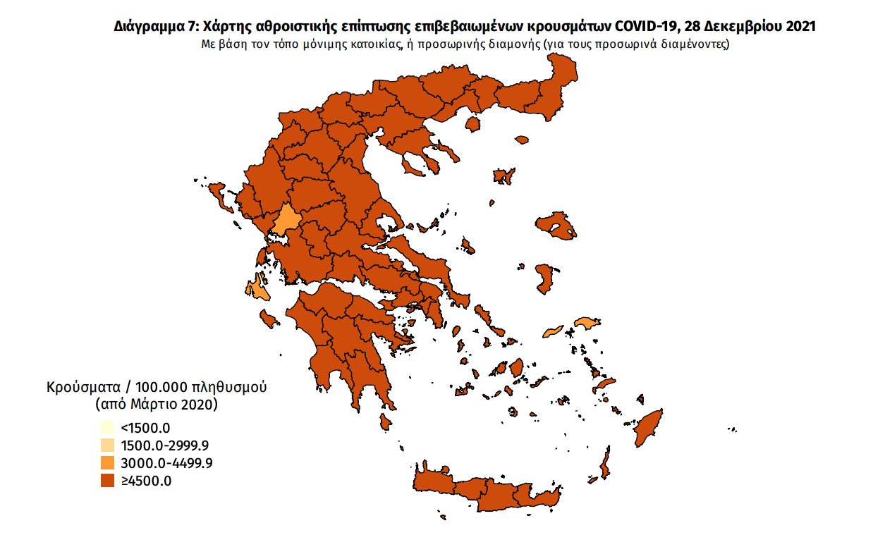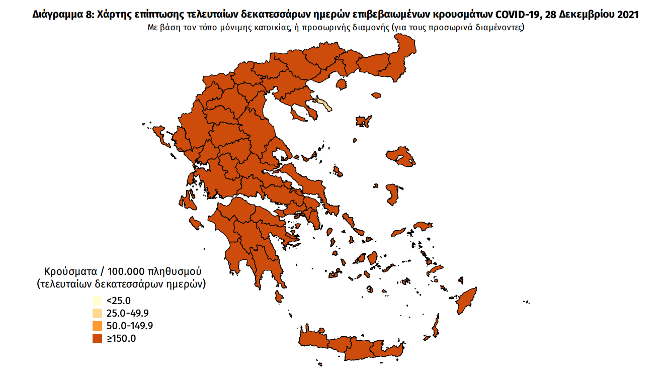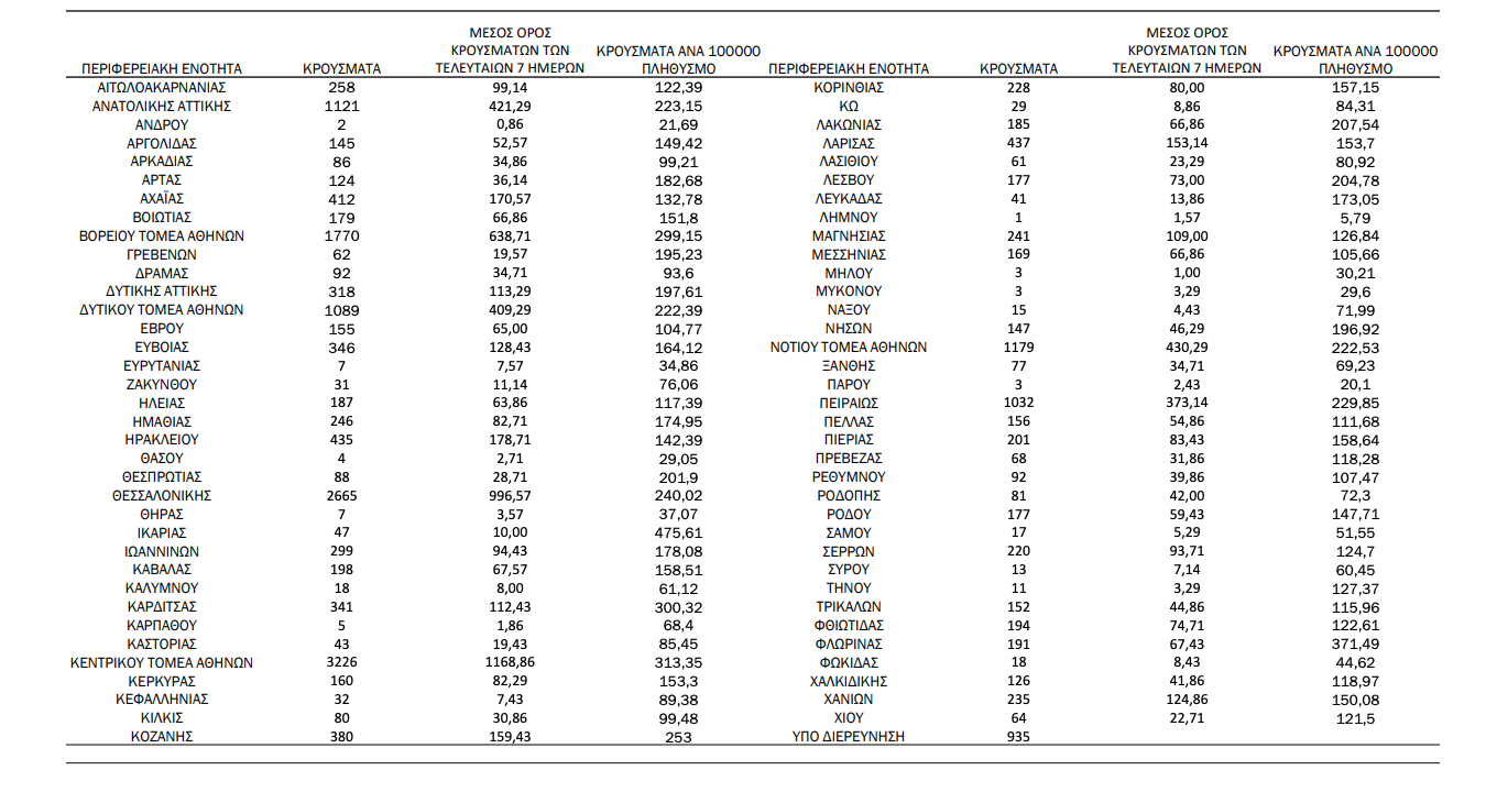 Κατανομή ανακοινωθέντων εγχώριων κρουσμάτων: Από το σύνολο των 21.657 κρουσμάτων του νέου ιού στη χώρα 20 είναι εισαγόμενα εκ των οποίων 14 εντοπίστηκαν κατόπιν ελέγχων στις πύλες εισόδου της χώρας. Η κατανομή των 21.637 νέων εγχώριων κρουσμάτων ανά Περιφερειακή Ενότητα παρουσιάζεται στον κατωτέρω πίνακα.5 Πίνακας 2: Ημερήσιος αριθμός και κρούσματα ανά 100.000 πληθυσμού επιβεβαιωμένων εγχώριων κρουσμάτων COVID-19 ανά περιφερειακή ενότητα στις 28 Δεκεμβρίου 2021