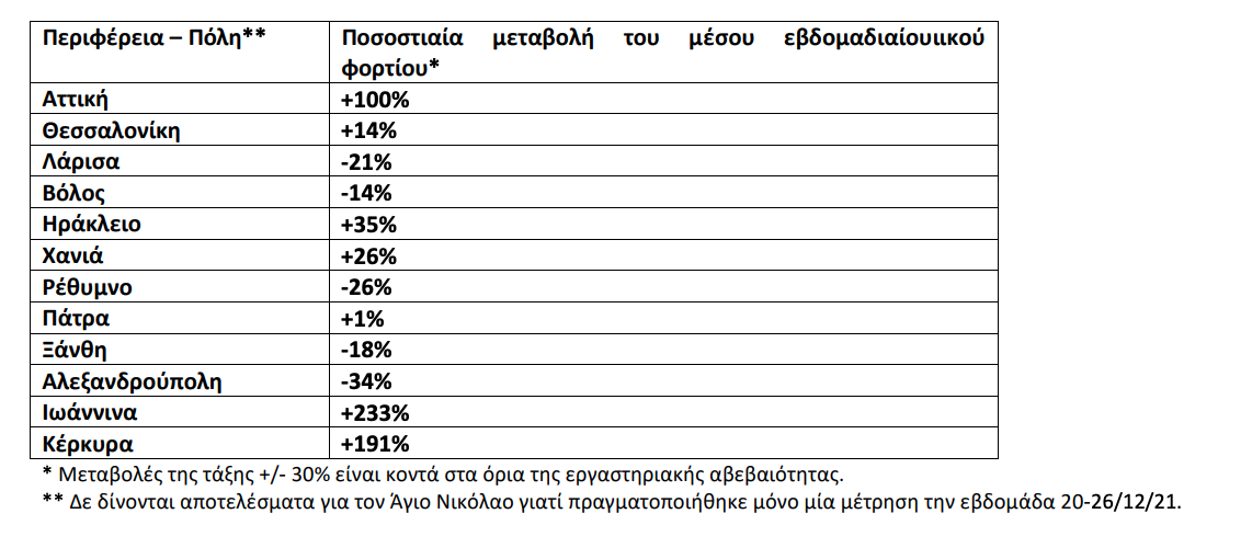 ΕΘΝΙΚΟ ΔΙΚΤΥΟ ΕΠΙΔΗΜΙΟΛΟΓΙΑΣ ΛΥΜΑΤΩΝ ΕΟΔΥ, Εβδομαδιαία έκθεση Ανακοινώνονται τα αποτελέσματα των εργαστηριακών ελέγχων του Εθνικού Δικτύου Επιδημιολογίας Λυμάτων για την επιδημιολογική επιτήρηση του ιού SARS-CoV-2 σε αστικά λύματα, το οποίο λειτουργεί υπό το συντονισμό του ΕΟΔΥ. Τα δείγματα προέρχονται από την Περιφέρεια Αττικής και τις πόλεις της Θεσσαλονίκης, της Λάρισας, του Βόλου, του Ηρακλείου, των Χανίων, του Ρεθύμνου, του Αγίου Νικολάου Λασιθίου, της Πάτρας, της Ξάνθης, της Αλεξανδρούπολης, των Ιωαννίνων και της Κέρκυρας. Τα δείγματα λαμβάνονται από τις εισόδους των κατά τόπους Μονάδων Επεξεργασίας Λυμάτων (ΜΕΛ) και αντιστοιχούν στον πληθυσμό που εξυπηρετείται από αυτές. Πίνακας 1: Ποσοστιαία μεταβολή στη μέση συγκέντρωση του ιικού φορτίου του SARS-CoV-2 στα αστικά λύματα ανά 100.000 κατοίκους την εβδομάδα 20–26/12/2021 σε σχέση με την εβδομάδα 13–19/12/2021.