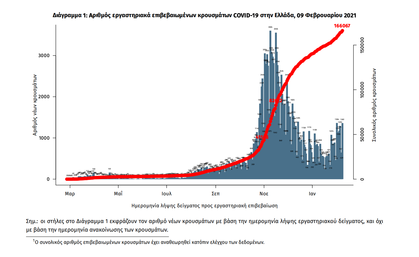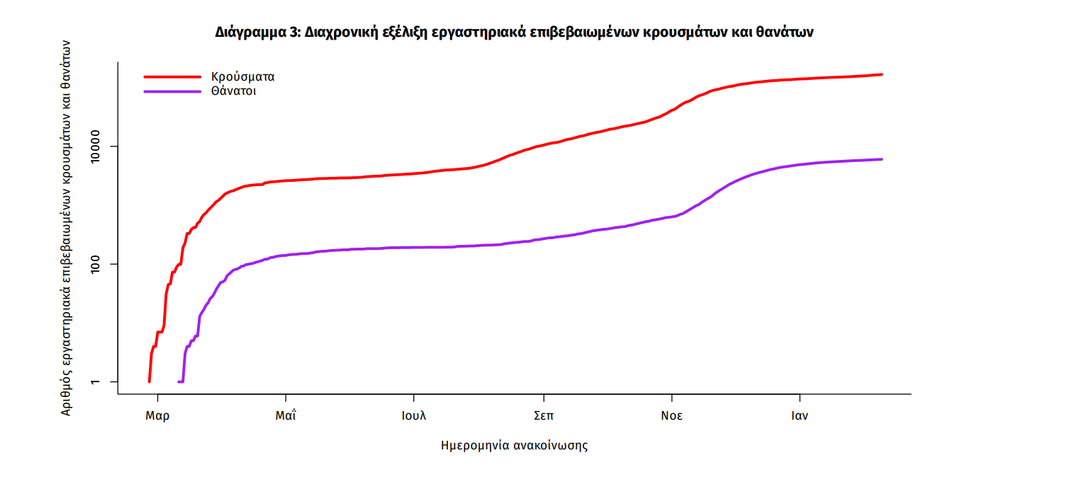 Η διαχρονική εξέλιξη των συνολικών κρουσμάτων και συνολικού αριθμού των θανάτων ασθενών COVID-19 παρουσιάζεται στο ακόλουθο διάγραμμα.