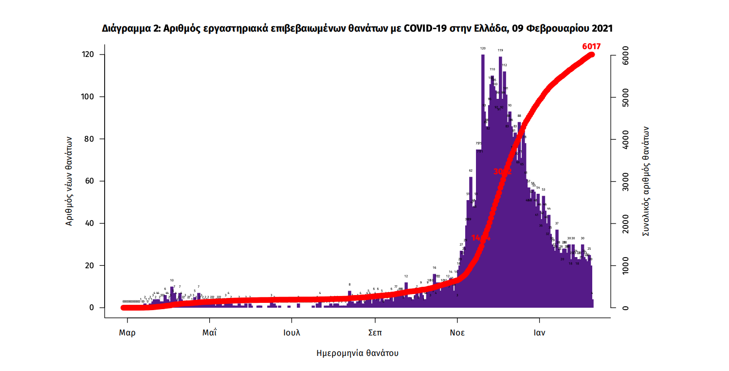 Τέλος, έχουμε 20 νέους θανάτους από τη νόσο COVID-19, φθάνοντας τους 6017 θανάτους συνολικά στη χώρα, εκ των οποίων 3534 (58.7%) άνδρες. Η διάμεση ηλικία των θανόντων συμπολιτών μας ήταν τα 79 έτη και το 95.6% είχε κάποιο υποκείμενο νόσημα ή/και ηλικία 70 ετών και άνω.