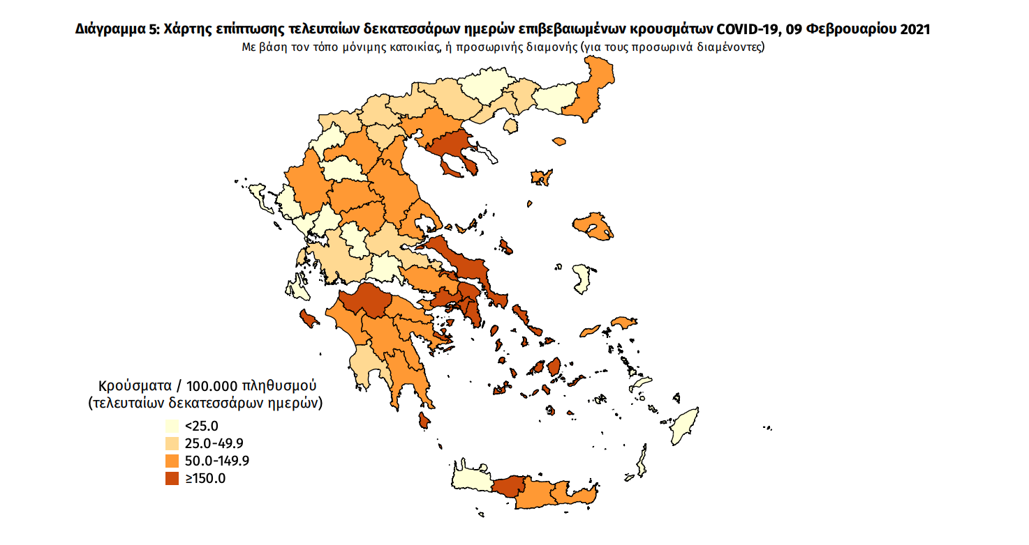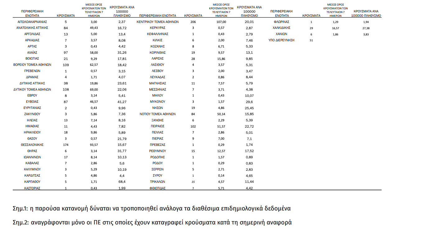 Γεωγραφική διασπορά Ο χάρτης αποτυπώνει τη γεωγραφική κατανομή των συνολικών κρουσμάτων COVID-19 (από την αρχή της επιδημίας) ανά Περιφερειακή Ενότητα της χώρας, με βάση την δηλωθείσα διεύθυνση μόνιμης κατοικίας του ασθενούς, ή τη διεύθυνση προσωρινής διαμονής για τους τουρίστες και άλλους προσωρινά διαμένοντες στην Ελλάδα. Συμπεριλαμβάνονται τόσο κρούσματα με ιστορικό ταξιδίου (“εισαγόμενα”) όσο και κρούσματα με πιθανή εγχώρια μετάδοση.
