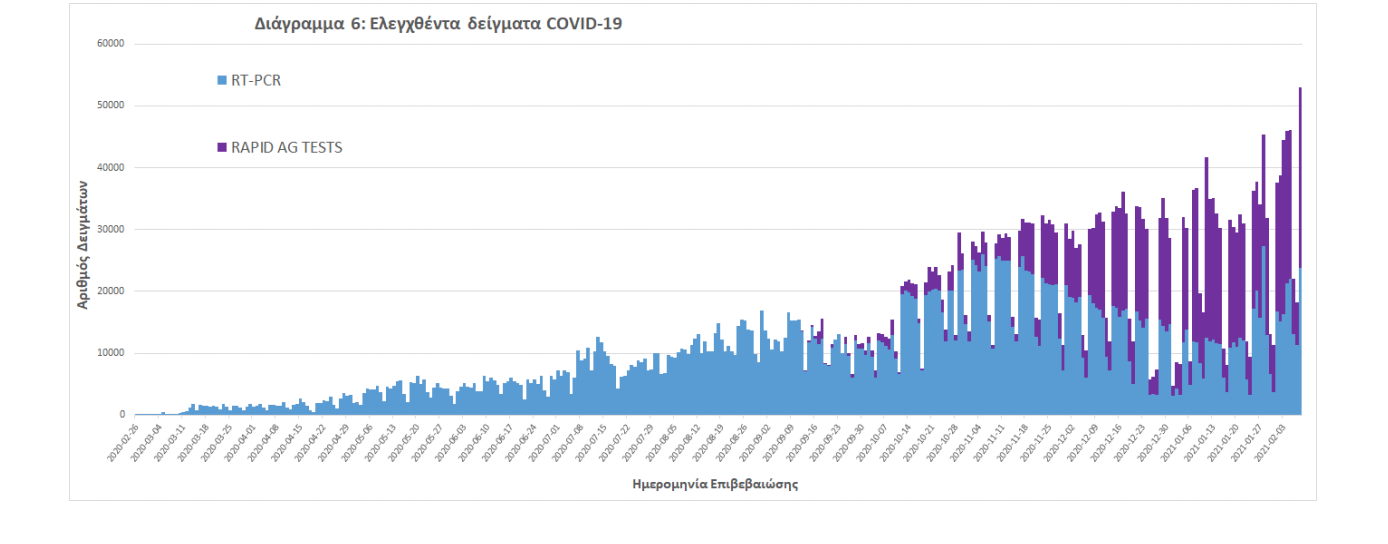 Δείγματα που έχουν ελεγχθεί: Από την 1η Ιανουαρίου 2020 μέχρι σήμερα, στα εργαστήρια που διενεργούν ελέγχους για τον νέο κορωνοϊό (SARS-CoV-2) και που δηλώνουν συστηματικά στον ΕΟΔΥ το σύνολο των δειγμάτων που ελέγχουν, έχουν συνολικά ελεγχθεί 3.277.437 κλινικά δείγματα ενώ από Μονάδες Υγείας και Κλιμάκια του ΕΟΔΥ που διενεργούν ελέγχους Rapid Ag έχουν ελεγχθεί 1.221.021 δείγματα.