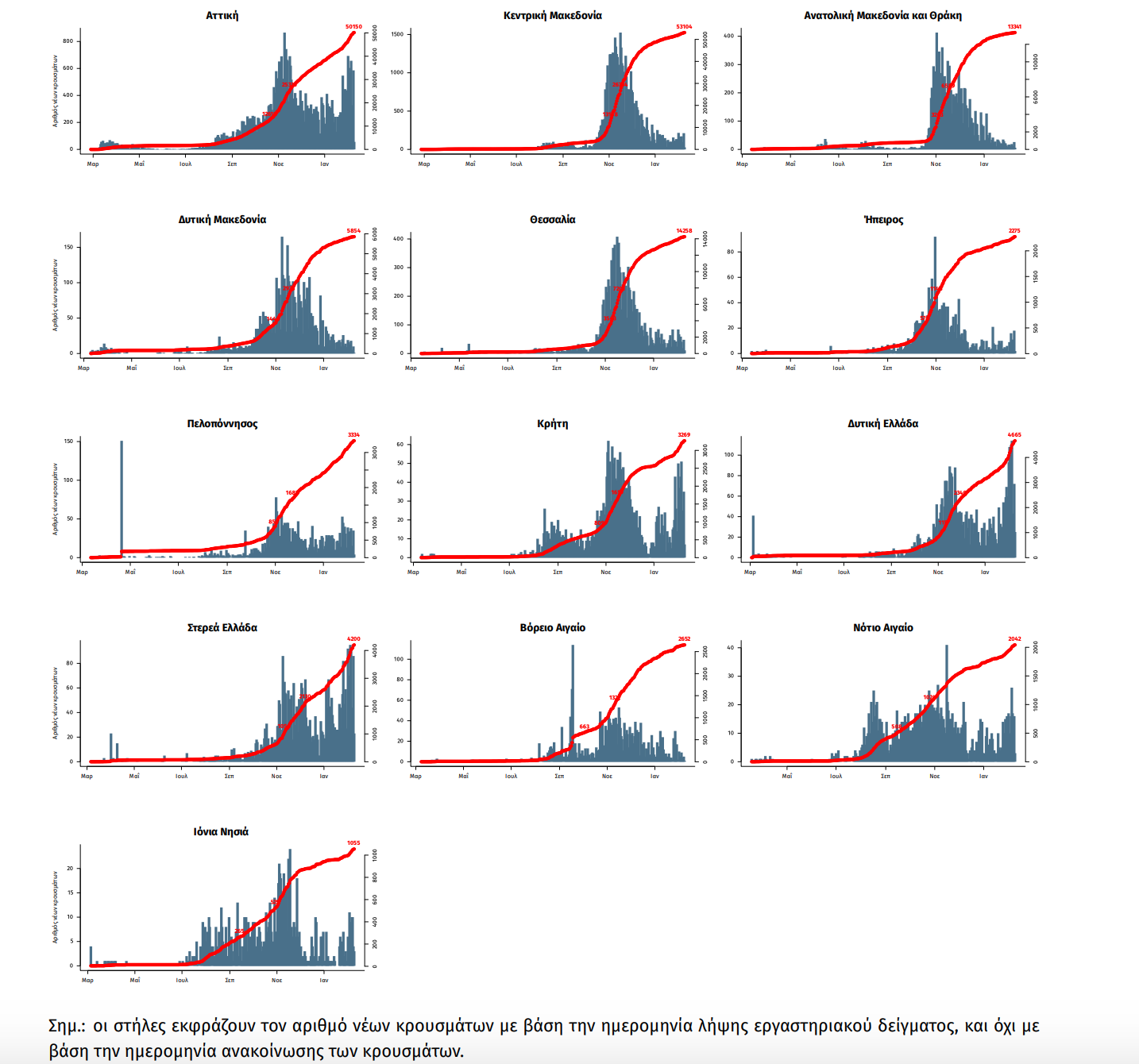 Παράρτημα 1: Επιδημικές καμπύλες κρουσμάτων COVID-19 με βάση την δηλωθείσα διεύθυνση μόνιμης κατοικίας του κρούσματος ή τη διεύθυνση προσωρινής διαμονής για τους τουρίστες και άλλους προσωρινά διαμένοντες στην Ελλάδα. Συμπεριλαμβάνονται τόσο κρούσματα με ιστορικό ταξιδίου όσο και κρούσματα με πιθανή εγχώρια μετάδοση.