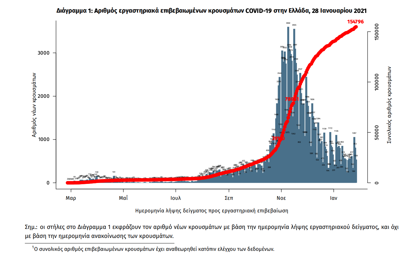 Τα στοιχεία που παρουσιάζονται αφορούν περιστατικά από την επιδημιολογική επιτήρηση της νόσου από το νέο κορωνοϊό (COVID19), με βάση τα δεδομένα που έχουν δηλωθεί στον ΕΟΔΥ και καταγραφεί μέχρι τις 28 Ιανουαρίου 2021 (ώρα 15:00). Τα νέα εργαστηριακά επιβεβαιωμένα κρούσματα της νόσου είναι 716, εκ των οποίων 7 εντοπίστηκαν κατόπιν ελέγχων στις πύλες εισόδου της χώρας. Ο συνολικός αριθμός των κρουσμάτων ανέρχεται σε 154796 (ημερήσια μεταβολή +0.5%), εκ των οποίων 52.1% άνδρες.