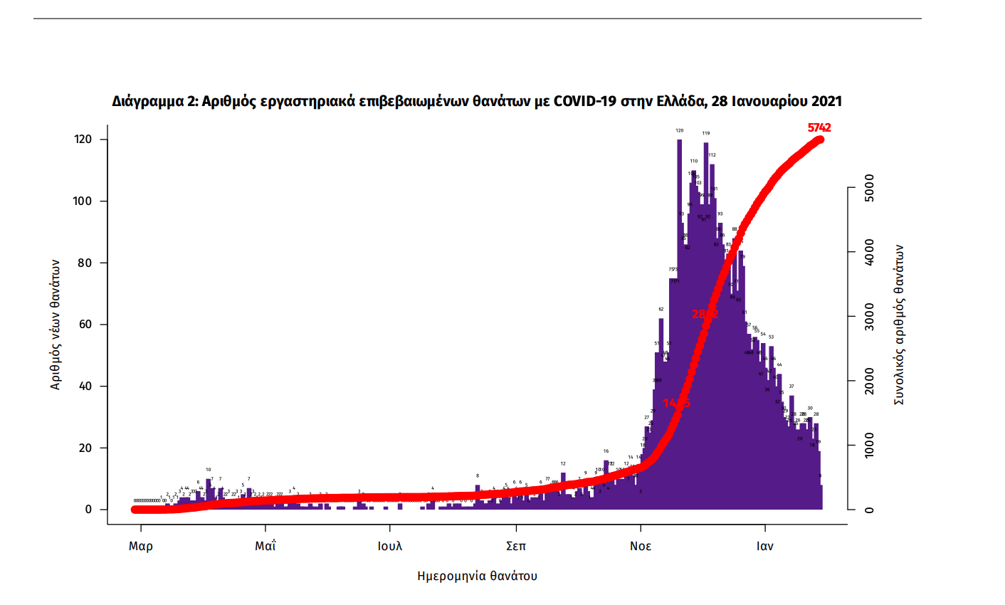 1 Οι νέοι θάνατοι ασθενών με COVID-19 είναι 18, ενώ από την έναρξη της επιδημίας έχουν καταγραφεί συνολικά 5742 θάνατοι. Η διάμεση ηλικία των ασθενών που απεβίωσαν είναι 79 έτη. Ο αριθμός των ασθενών που νοσηλεύονται διασωληνωμένοι είναι 268 (72.4% άνδρες). Η ημερήσια κατανομή των επιβεβαιωμένων κρουσμάτων είναι η ακόλουθη (η γραμμή παριστάνει την συνολική, αθροιστική κατανομή των κρουσμάτων).