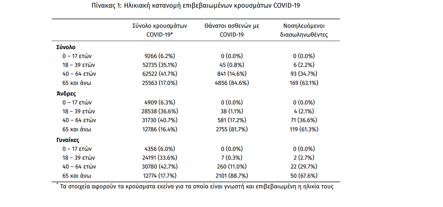 Τέλος, έχουμε 18 νέους θανάτους από τη νόσο COVID-19, φθάνοντας τους 5742 θανάτους συνολικά στη χώρα, εκ των οποίων 3374 (58.8%) άνδρες. Η διάμεση ηλικία των θανόντων συμπολιτών μας ήταν τα 79 έτη και το 95.5% είχε κάποιο υποκείμενο νόσημα ή/και ηλικία 70 ετών και άνω.