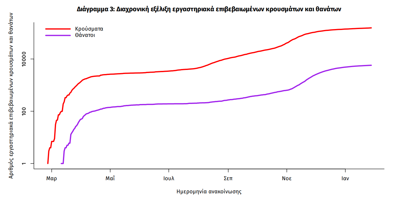 Η διαχρονική εξέλιξη των συνολικών κρουσμάτων και συνολικού αριθμού των θανάτων ασθενών COVID-19 παρουσιάζεται στο ακόλουθο διάγραμμα