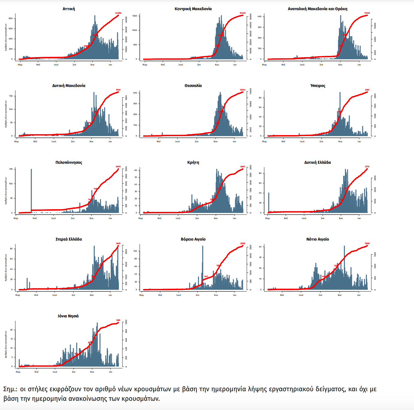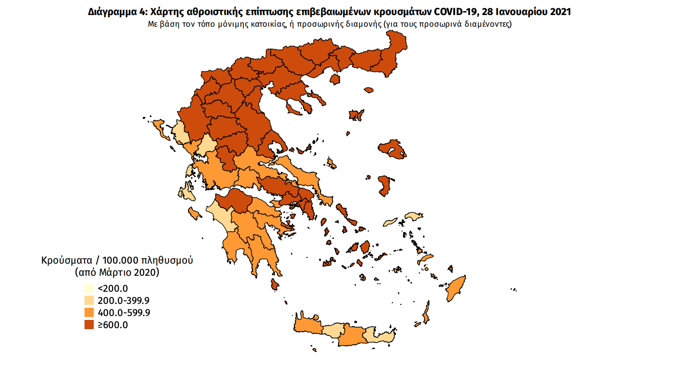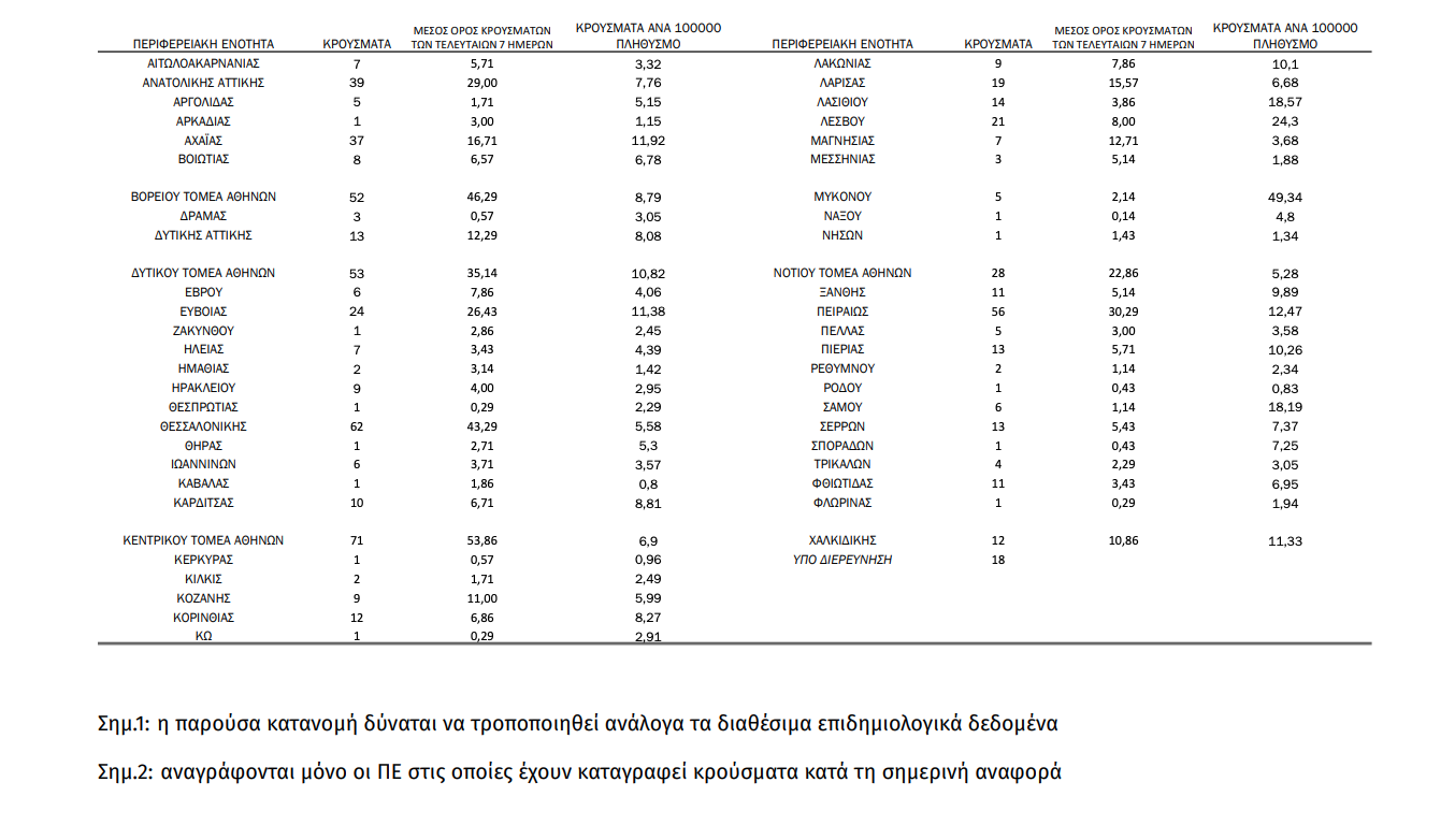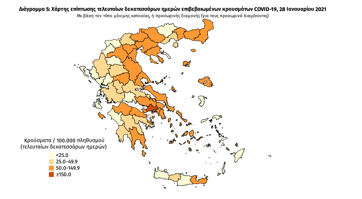 Γεωγραφική διασπορά Ο χάρτης αποτυπώνει τη γεωγραφική κατανομή των συνολικών κρουσμάτων COVID-19 (από την αρχή της επιδημίας) ανά Περιφερειακή Ενότητα της χώρας, με βάση την δηλωθείσα διεύθυνση μόνιμης κατοικίας του ασθενούς, ή τη διεύθυνση προσωρινής διαμονής για τους τουρίστες και άλλους προσωρινά διαμένοντες στην Ελλάδα. Συμπεριλαμβάνονται τόσο κρούσματα με ιστορικό ταξιδίου (“εισαγόμενα”) όσο και κρούσματα με πιθανή εγχώρια μετάδοση.