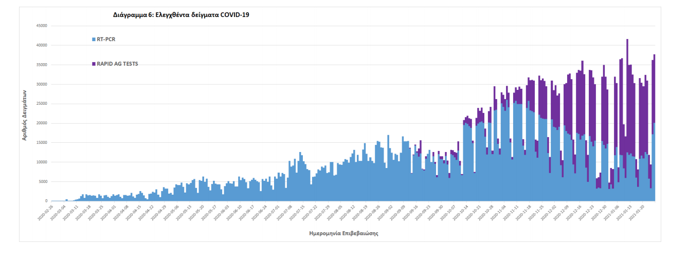 Δείγματα που έχουν ελεγχθεί: Από την 1η Ιανουαρίου 2020 μέχρι σήμερα, στα εργαστήρια που διενεργούν ελέγχους για τον νέο κορωνοϊό (SARS-CoV-2) και που δηλώνουν συστηματικά στον ΕΟΔΥ το σύνολο των δειγμάτων που ελέγχουν, έχουν συνολικά ελεγχθεί 3.087.133 κλινικά δείγματα ενώ από Μονάδες Υγείας και Κλιμάκια του ΕΟΔΥ που διενεργούν ελέγχους Rapid Ag έχουν ελεγχθεί 1.003.740 δείγματα.