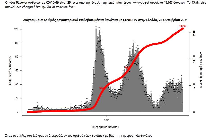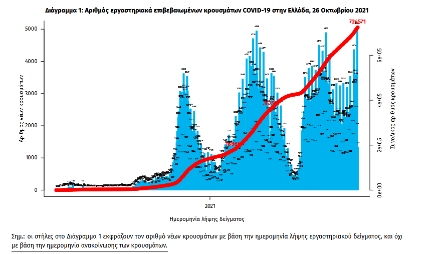 Τα στοιχεία που παρουσιάζονται αφορούν περιστατικά από την επιδημιολογική επιτήρηση της νόσου από το νέο κορωνοϊό (COVID-19), με βάση τα δεδομένα που έχουν δηλωθεί στον ΕΟΔΥ και καταγραφεί μέχρι τις 26 Οκτωβρίου 2021 (ώρα 15:00).