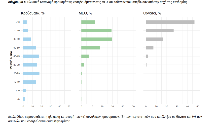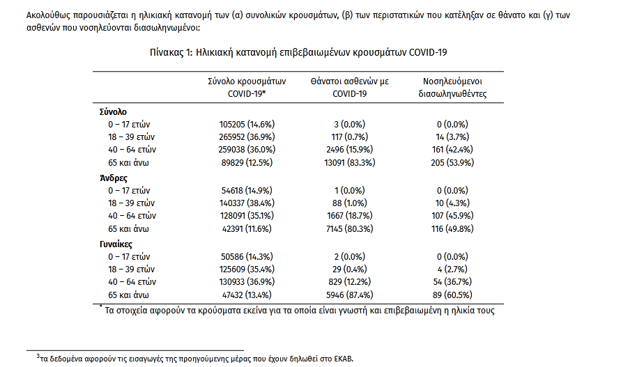 Οι εισαγωγές 3 νέων ασθενών Covid-19 στα νοσοκομεία της επικράτειας είναι 261 (ημερήσια μεταβολή +19.18%). Ο μέσος όρος εισαγωγών του επταημέρου είναι 236 ασθενείς.Η διάμεση ηλικία των κρουσμάτων είναι 39 έτη (εύρος 0.2 έως 106 έτη), ενώ η διάμεση ηλικία των θανόντων είναι 78 έτη (εύρος 0.2 έως 106 έτη)