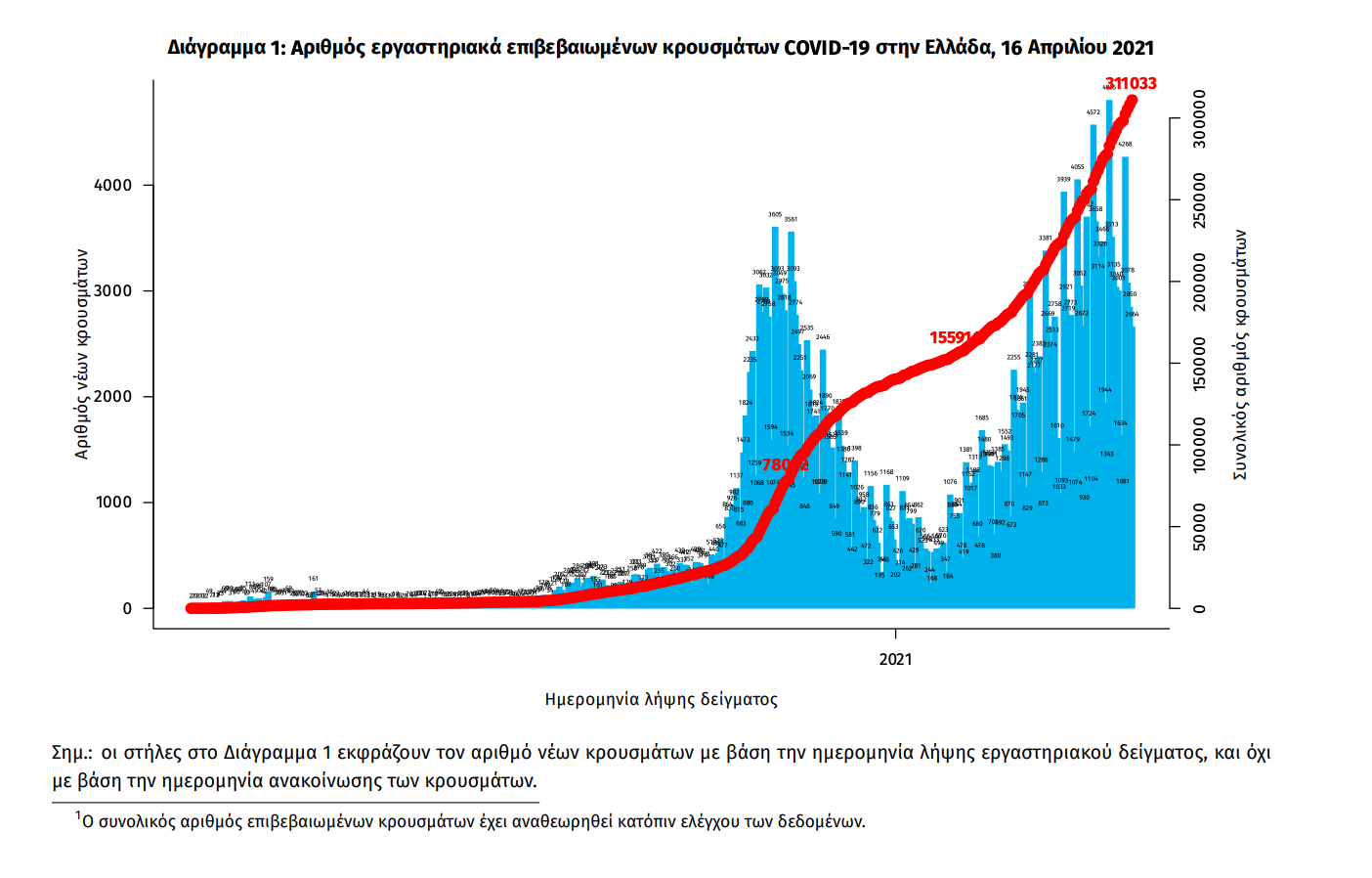Ο συνολικός αριθμός των κρουσμάτων ανέρχεται σε 311.033 (ημερήσια μεταβολή +1.0%), εκ των οποίων 51.3% άνδρες. 1 Με βάση τα επιβεβαιωμένα κρούσματα των τελευταίων 7 ημερών, 57 θεωρούνται σχετιζόμενα με ταξίδι από το εξωτερικό και 2.990 είναι σχετιζόμενα με ήδη γνωστό κρούσμα. Ημερήσια εξέλιξη της πανδημίας: Η ημερήσια κατανομή των επιβεβαιωμένων κρουσμάτων είναι η ακόλουθη (η γραμμή παριστάνει την συνολική, αθροιστική κατανομή των κρουσμάτων).