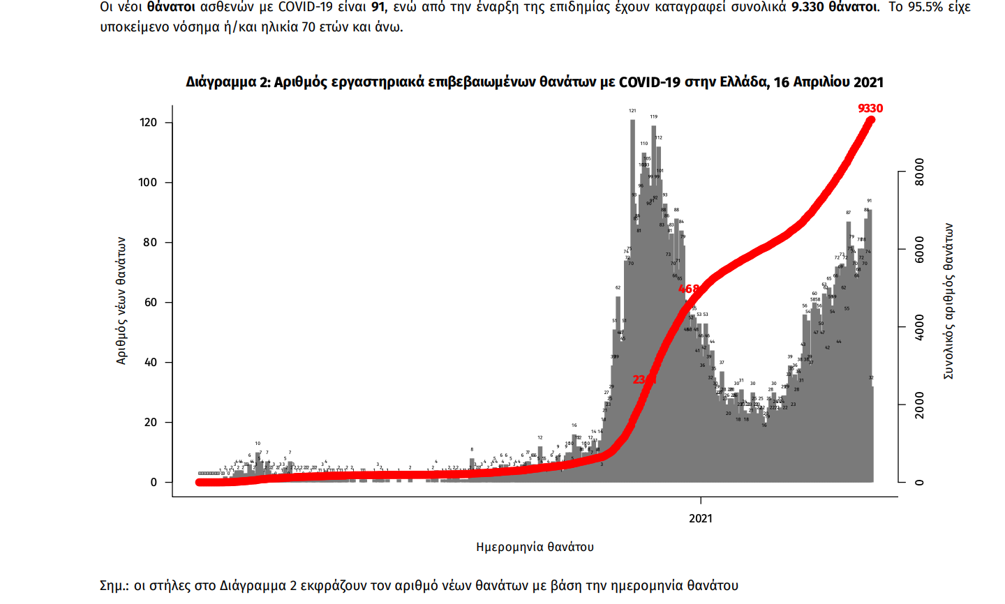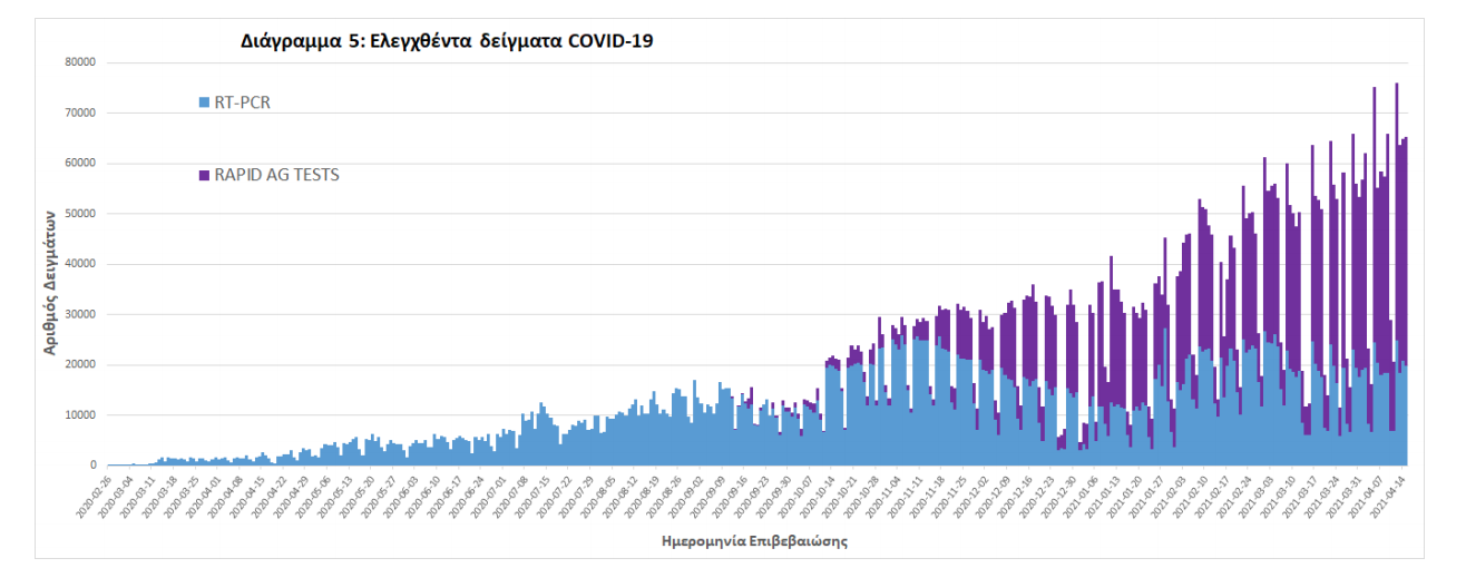 Δείγματα που έχουν ελεγχθεί: Από την 1η Ιανουαρίου 2020 μέχρι σήμερα, στα εργαστήρια που διενεργούν ελέγχους για τον νέο κορωνοϊό (SARS-CoV-2) και που δηλώνουν συστηματικά το σύνολο των δειγμάτων που ελέγχουν, έχουν συνολικά ελεγχθεί 4.440.181 κλινικά δείγματα ενώ από Μονάδες Υγείας και Κλιμάκια του ΕΟΔΥ που διενεργούν ελέγχους Rapid Ag έχουν ελεγχθεί 2.939.277 δείγματα. O μέσος όρος του επταημέρου είναι 55.060 δειγματοληπτικοί έλεγχοι ημερησίως. Mαζικές Δειγματοληψίες ΕΟΔΥ: Στις 15 Απριλίου 2021, πραγματοποιήθηκαν 121 δράσεις δειγματοληπτικών ελέγχων από τις Κινητές Ομάδες Υγείας (ΚΟΜΥ) του ΕΟΔΥ, στις οποίες διενεργήθηκαν 17.075 έλεγχοι Rapid Ag και ανευρέθηκαν 393 θετικά (2,30%).