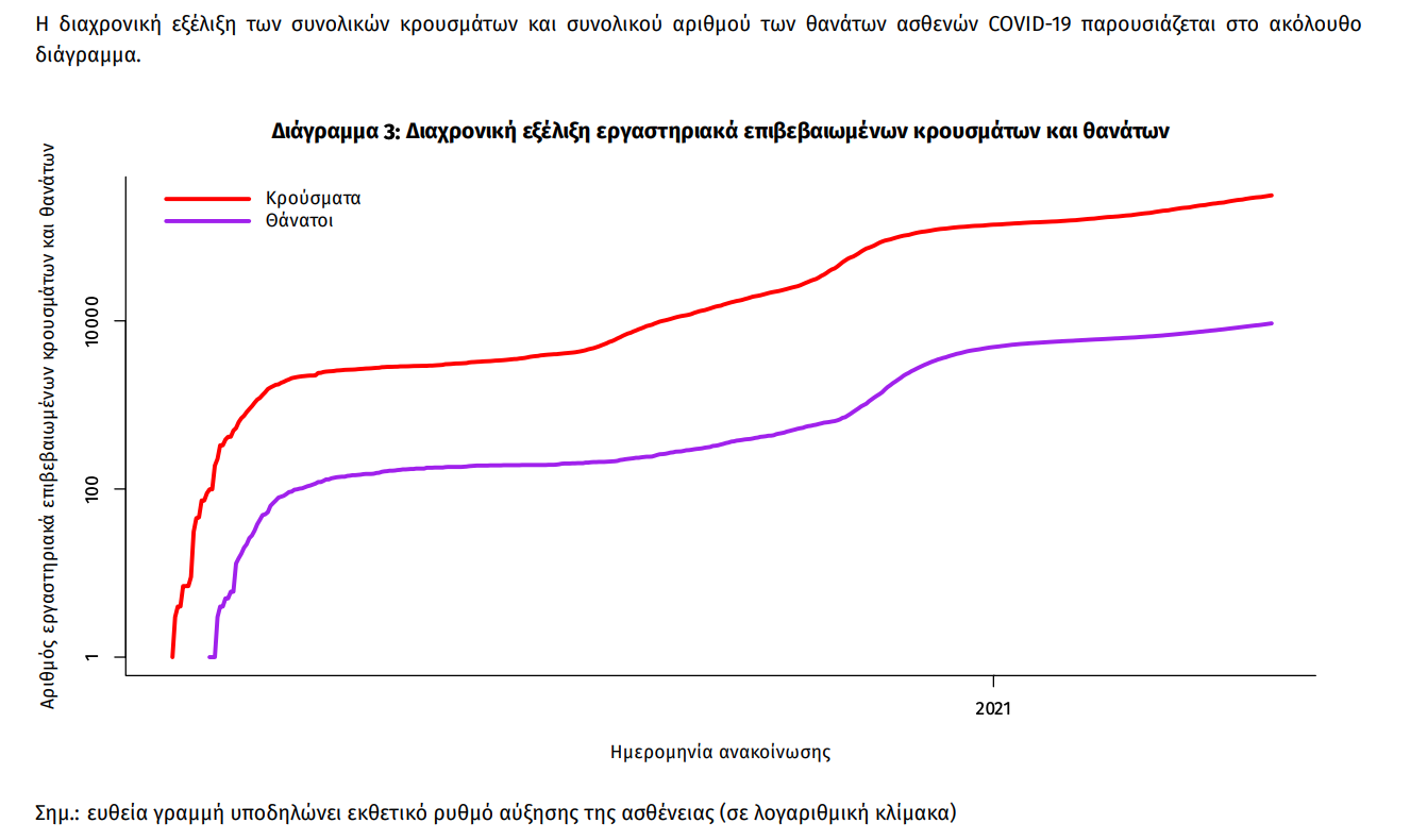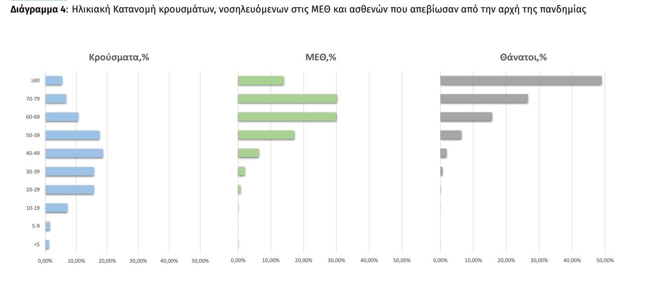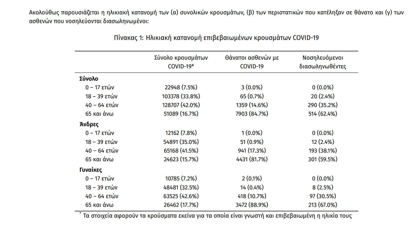 Ο αριθμός των ασθενών που νοσηλεύονται διασωληνωμένοι είναι 824 (61.5% άνδρες). Η διάμεση ηλικία τους είναι 68 έτη. To 85.1% έχει υποκείμενο νόσημα ή/και ηλικία 70 ετών και άνω. Από την αρχή της πανδημίας έχουν εξέλθει από τις ΜΕΘ 1.927 ασθενείς. Οι εισαγωγές2 νέων ασθενών Covid-19 στα νοσοκομεία της επικράτειας είναι 547 (ημερήσια μεταβολή +3.99%). Ο μέσος όρος εισαγωγών του επταημέρου είναι 514 ασθενείς.Η διάμεση ηλικία των κρουσμάτων είναι 44 έτη (εύρος 0.2 έως 106 έτη), ενώ η διάμεση ηλικία των θανόντων είναι 79 έτη (εύρος 0.2 έως 106 έτη).