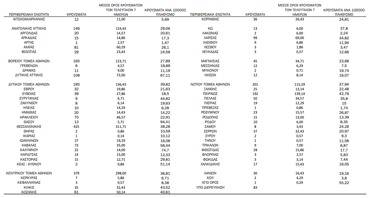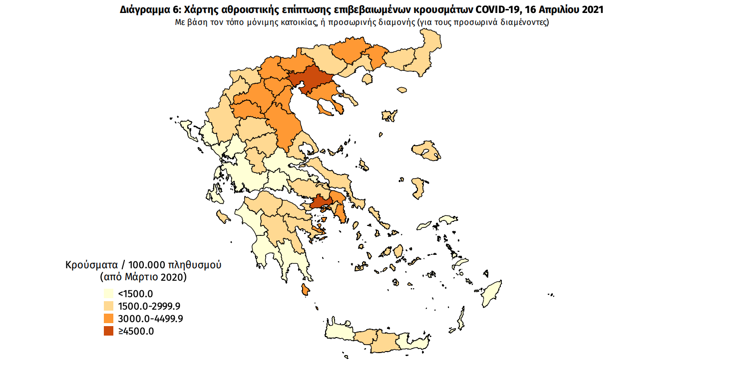 Γεωγραφική διασπορά: Ο χάρτης αποτυπώνει τη γεωγραφική κατανομή των συνολικών κρουσμάτων COVID-19 (από την αρχή της επιδημίας) ανά Περιφερειακή Ενότητα της χώρας, με βάση την δηλωθείσα διεύθυνση μόνιμης κατοικίας του ασθενούς, ή τη διεύθυνση προσωρινής διαμονής για τους τουρίστες και άλλους προσωρινά διαμένοντες στην Ελλάδα. Συμπεριλαμβάνονται τόσο κρούσματα με ιστορικό ταξιδίου (“εισαγόμενα”) όσο και κρούσματα με πιθανή εγχώρια μετάδοση.