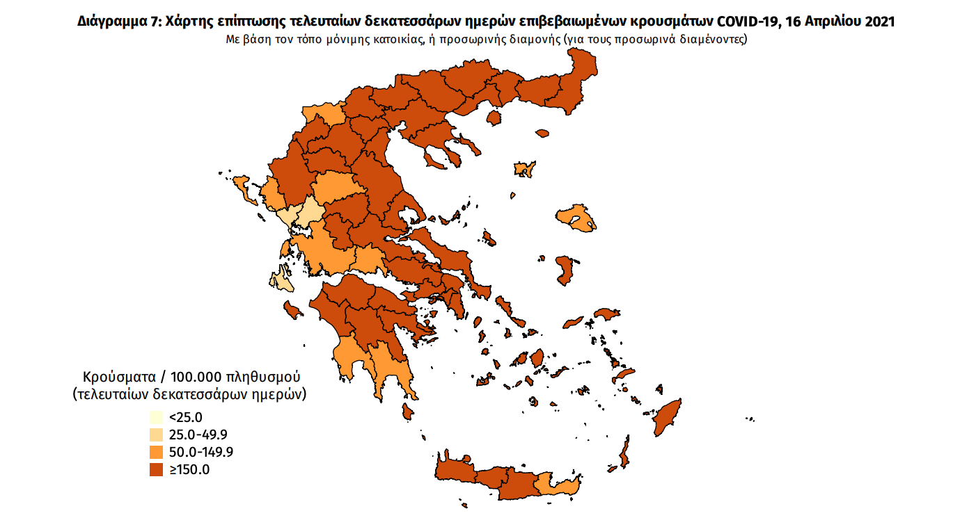 Τα στοιχεία που παρουσιάζονται αφορούν περιστατικά από την επιδημιολογική επιτήρηση της νόσου από το νέο κορωνοϊό (COVID19), με βάση τα δεδομένα που έχουν δηλωθεί στον ΕΟΔΥ και καταγραφεί μέχρι τις 16 Απριλίου 2021 (ώρα 15:00). Τα νέα εργαστηριακά επιβεβαιωμένα κρούσματα της νόσου που καταγράφηκαν τις τελευταίες 24 ώρες είναι 3.067, εκ των οποίων 13 εντοπίστηκαν κατόπιν ελέγχων στις πύλες εισόδου της χώρας.