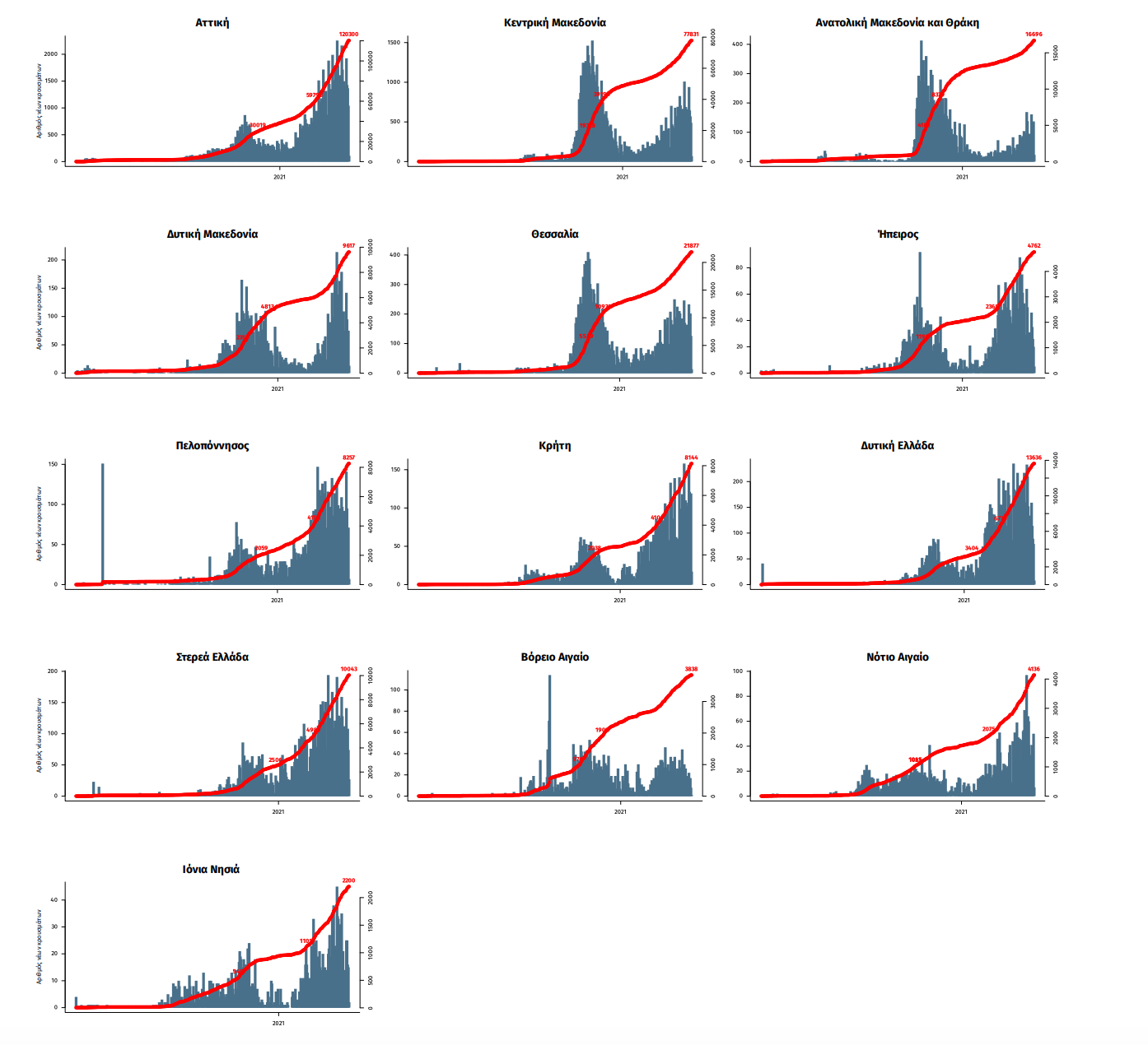 Παράρτημα 1: Επιδημικές καμπύλες κρουσμάτων COVID-19 με βάση την δηλωθείσα διεύθυνση μόνιμης κατοικίας του κρούσματος ή τη διεύθυνση προσωρινής διαμονής για τους τουρίστες και άλλους προσωρινά διαμένοντες στην Ελλάδα. Συμπεριλαμβάνονται τόσο κρούσματα με ιστορικό ταξιδίου όσο και κρούσματα με πιθανή εγχώρια μετάδοση.