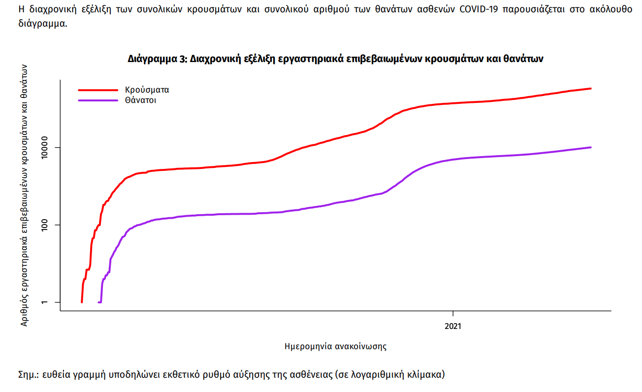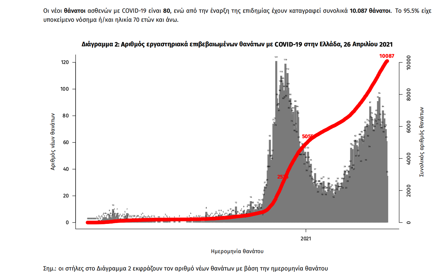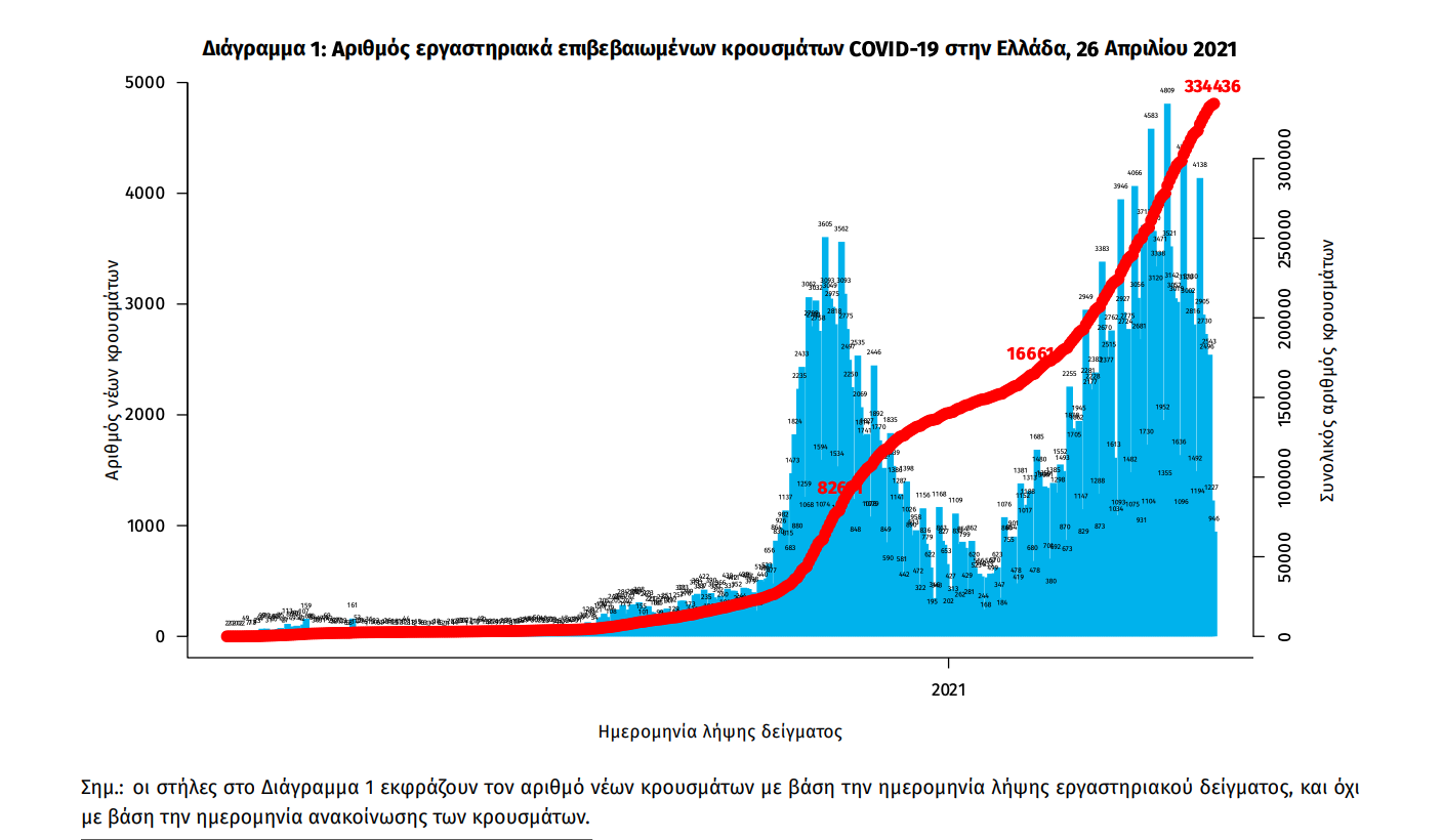 Τα στοιχεία που παρουσιάζονται αφορούν περιστατικά από την επιδημιολογική επιτήρηση της νόσου από το νέο κορωνοϊό (COVID19), με βάση τα δεδομένα που έχουν δηλωθεί στον ΕΟΔΥ και καταγραφεί μέχρι τις 26 Απριλίου 2021 (ώρα 15:00). Τα νέα εργαστηριακά επιβεβαιωμένα κρούσματα της νόσου που καταγράφηκαν τις τελευταίες 24 ώρες είναι 1.317, εκ των οποίων 7 εντοπίστηκαν κατόπιν ελέγχων στις πύλες εισόδου της χώρας. Ο συνολικός αριθμός των κρουσμάτων ανέρχεται σε 334.436 (ημερήσια μεταβολή +0.4%), εκ των οποίων 51.3% άνδρες. 1 Με βάση τα επιβεβαιωμένα κρούσματα των τελευταίων 7 ημερών, 69 θεωρούνται σχετιζόμενα με ταξίδι από το εξωτερικό και 2.662 είναι σχετιζόμενα με ήδη γνωστό κρούσμα. Ημερήσια εξέλιξη της πανδημίας: Η ημερήσια κατανομή των επιβεβαιωμένων κρουσμάτων είναι η ακόλουθη (η γραμμή παριστάνει την συνολική, αθροιστική κατανομή των κρουσμάτων).