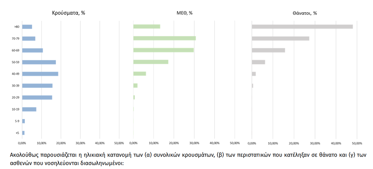 Ακολούθως παρουσιάζεται η ηλικιακή κατανομή των (α) συνολικών κρουσμάτων, (β) των περιστατικών που κατέληξαν σε θάνατο και (γ) των ασθενών που νοσηλεύονται διασωληνωμένοι