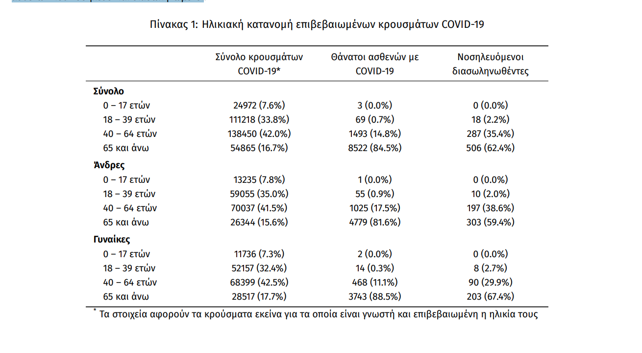 Ο αριθμός των ασθενών που νοσηλεύονται διασωληνωμένοι είναι 811 (63.1% άνδρες). Η διάμεση ηλικία τους είναι 68 έτη. To 84.7% έχει υποκείμενο νόσημα ή/και ηλικία 70 ετών και άνω. Από την αρχή της πανδημίας έχουν εξέλθει από τις ΜΕΘ 2.050 ασθενείς. Οι εισαγωγές2 νέων ασθενών Covid-19 στα νοσοκομεία της επικράτειας είναι 451 (ημερήσια μεταβολή -6.24%). Ο μέσος όρος εισαγωγών του επταημέρου είναι 470 ασθενείς.Η διάμεση ηλικία των κρουσμάτων είναι 44 έτη (εύρος 0.2 έως 106 έτη), ενώ η διάμεση ηλικία των θανόντων είναι 78 έτη (εύρος 0.2 έως 106 έτη). Διάγραμμα 4: Ηλικιακή Κατανομή κρουσμάτων, νοσηλευόμενων στις MEΘ και ασθενών που απεβίωσαν από την αρχή της πανδημίας