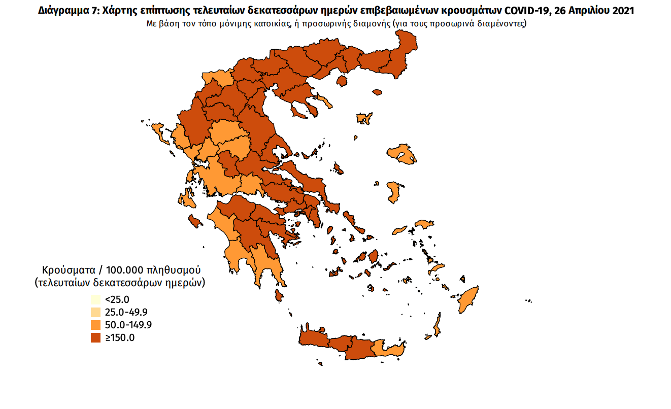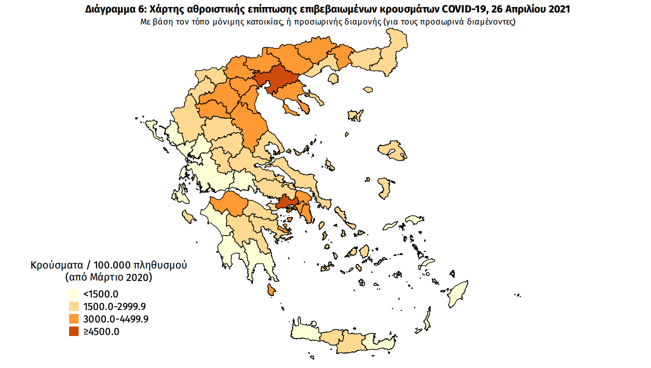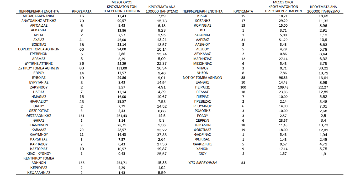 Γεωγραφική διασπορά: Ο χάρτης αποτυπώνει τη γεωγραφική κατανομή των συνολικών κρουσμάτων COVID-19 (από την αρχή της επιδημίας) ανά Περιφερειακή Ενότητα της χώρας, με βάση την δηλωθείσα διεύθυνση μόνιμης κατοικίας του ασθενούς, ή τη διεύθυνση προσωρινής διαμονής για τους τουρίστες και άλλους προσωρινά διαμένοντες στην Ελλάδα. Συμπεριλαμβάνονται τόσο κρούσματα με ιστορικό ταξιδίου (“εισαγόμενα”) όσο και κρούσματα με πιθανή εγχώρια μετάδοση.