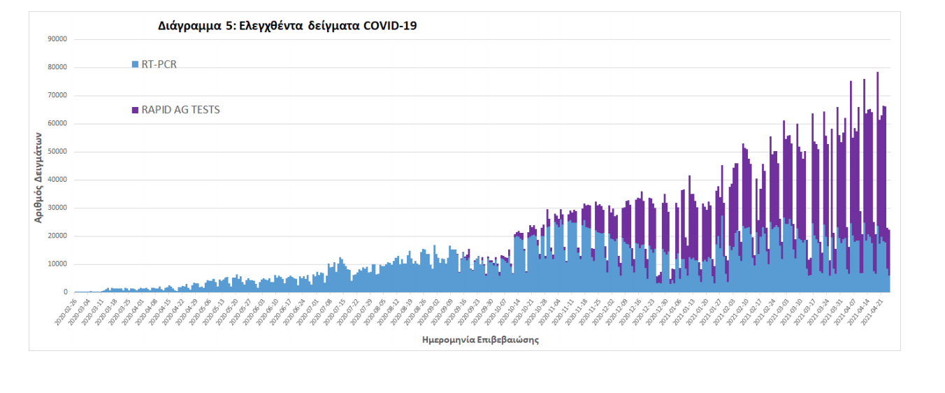 Δείγματα που έχουν ελεγχθεί: Από την 1η Ιανουαρίου 2020 μέχρι σήμερα, στα εργαστήρια που διενεργούν ελέγχους για τον νέο κορωνοϊό (SARS-CoV-2) και που δηλώνουν συστηματικά το σύνολο των δειγμάτων που ελέγχουν, έχουν συνολικά ελεγχθεί 4.583.653 κλινικά δείγματα ενώ από Μονάδες Υγείας και Κλιμάκια του ΕΟΔΥ που διενεργούν ελέγχους Rapid Ag έχουν ελεγχθεί 3.286.794 δείγματα. O μέσος όρος του επταημέρου είναι 54.399 δειγματοληπτικοί έλεγχοι ημερησίως. Mαζικές Δειγματοληψίες ΕΟΔΥ: Στις 25 Απριλίου 2021, πραγματοποιήθηκαν 36 δράσεις δειγματοληπτικών ελέγχων από τις Κινητές Ομάδες Υγείας (ΚΟΜΥ) του ΕΟΔΥ, στις οποίες διενεργήθηκαν 8.027 έλεγχοι Rapid Ag και ανευρέθηκαν 170 θετικά (2,12%).