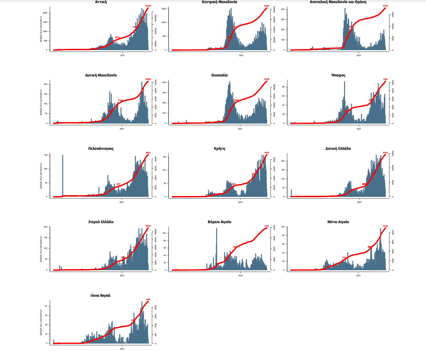 Παράρτημα 1: Επιδημικές καμπύλες κρουσμάτων COVID-19 με βάση την δηλωθείσα διεύθυνση μόνιμης κατοικίας του κρούσματος ή τη διεύθυνση προσωρινής διαμονής για τους τουρίστες και άλλους προσωρινά διαμένοντες στην Ελλάδα. Συμπεριλαμβάνονται τόσο κρούσματα με ιστορικό ταξιδίου όσο και κρούσματα με πιθανή εγχώρια μετάδοση.