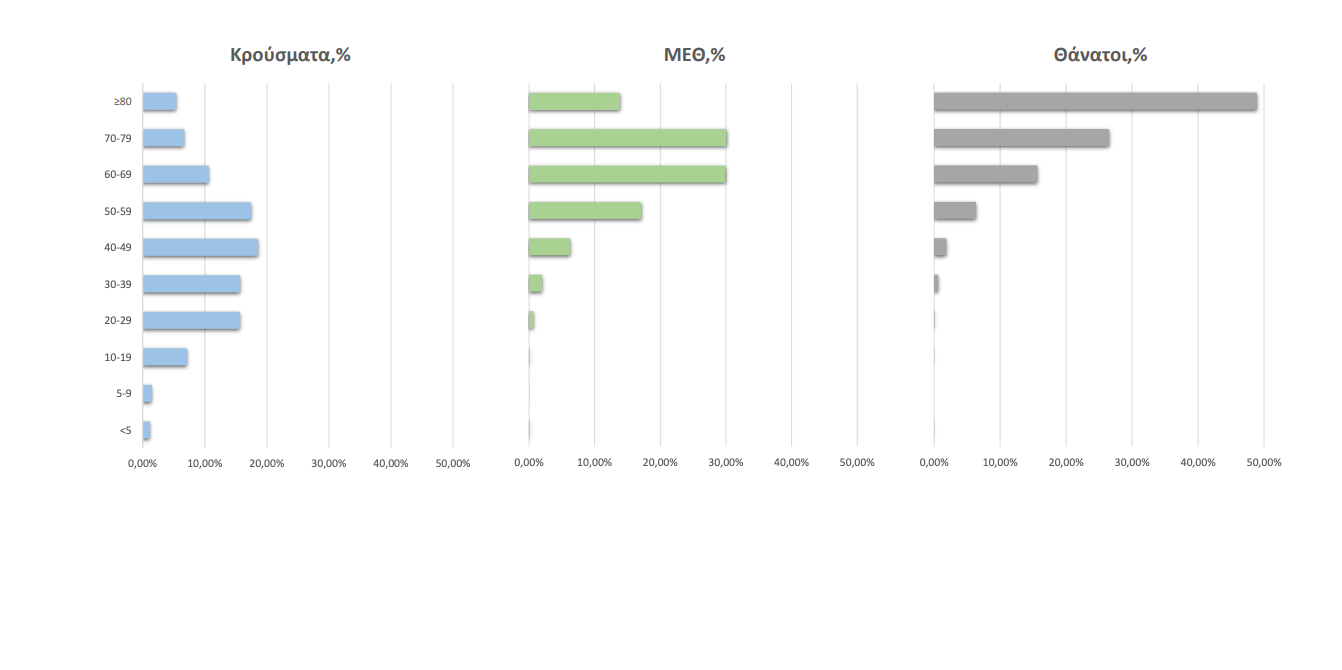 Ακολούθως παρουσιάζεται η ηλικιακή κατανομή των (α) συνολικών κρουσμάτων, (β) των περιστατικών που κατέληξαν σε θάνατο και (γ) των ασθενών που νοσηλεύονται διασωληνωμένοι: