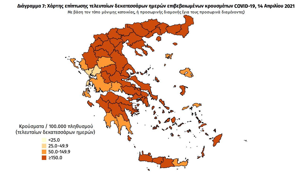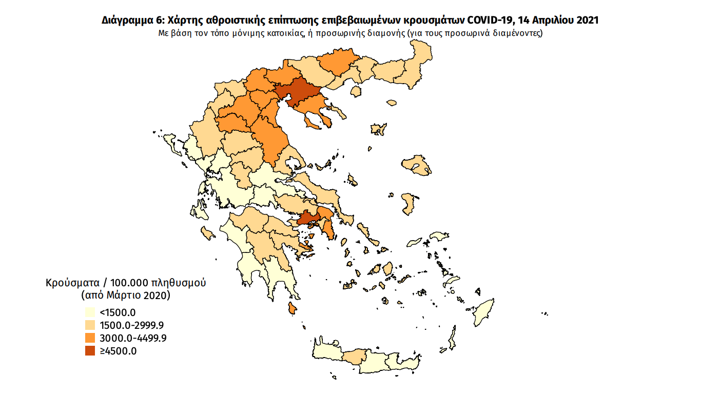 Γεωγραφική διασπορά: Ο χάρτης αποτυπώνει τη γεωγραφική κατανομή των συνολικών κρουσμάτων COVID-19 (από την αρχή της επιδημίας) ανά Περιφερειακή Ενότητα της χώρας, με βάση την δηλωθείσα διεύθυνση μόνιμης κατοικίας του ασθενούς, ή τη διεύθυνση προσωρινής διαμονής για τους τουρίστες και άλλους προσωρινά διαμένοντες στην Ελλάδα. Συμπεριλαμβάνονται τόσο κρούσματα με ιστορικό ταξιδίου (“εισαγόμενα”) όσο και κρούσματα με πιθανή εγχώρια μετάδοση.